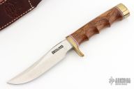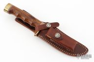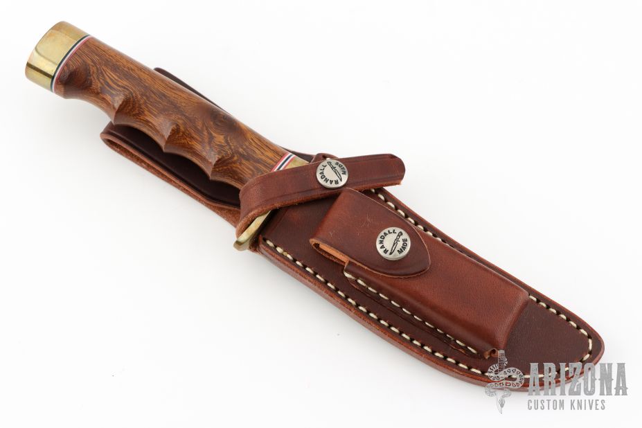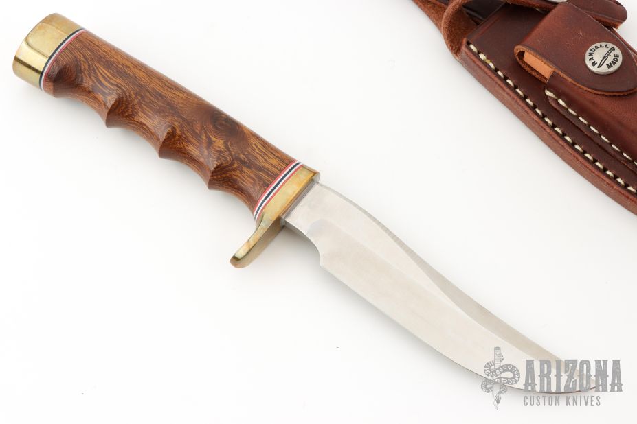 This model 3-5 by Randall Made Knives has a satin finished blade with false top edge, .198" blade stock and 1.071" blade depth, hidden tang construction. The handle has a brass guard and butt, Ironwood grip with finger grooves, red/white/blue spacers. It Includes brown leather sheath with stone, and original paper wrapping. Excellent condition.