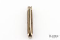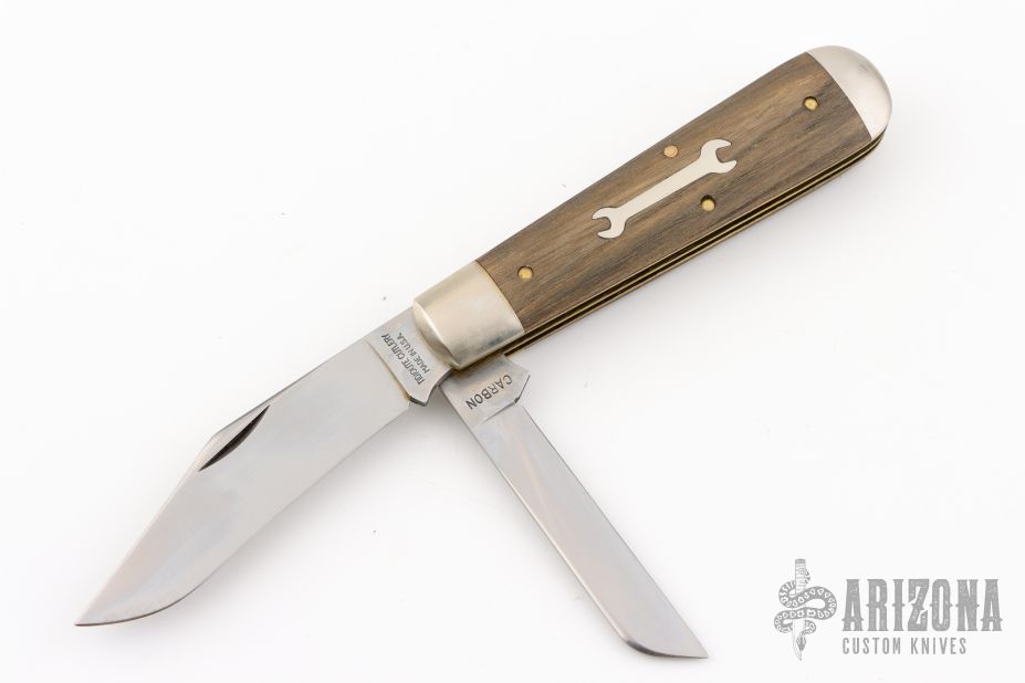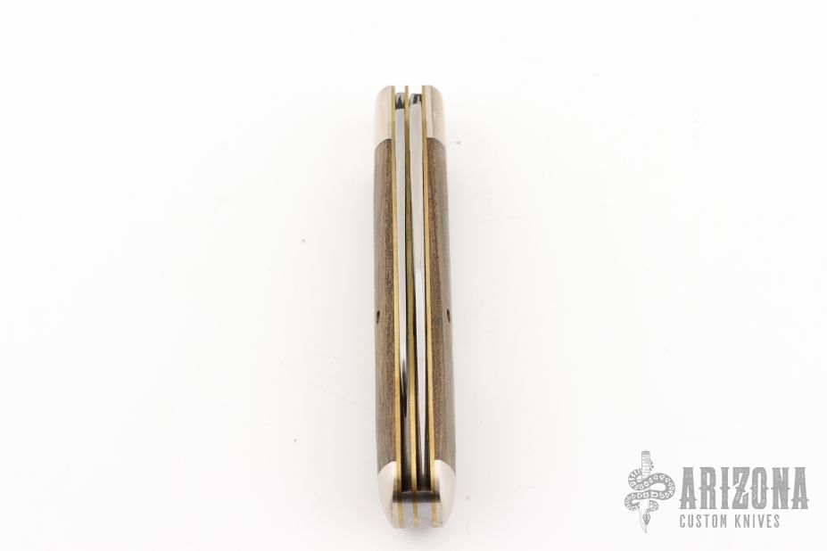 This slipjoint from Tidioute features 2 satin finished blades with nail nicks. The handle has nickel silver bolsters, wood covers with brass liners, and steel springs. Includes original tube, paper, and button. Excellent condition.