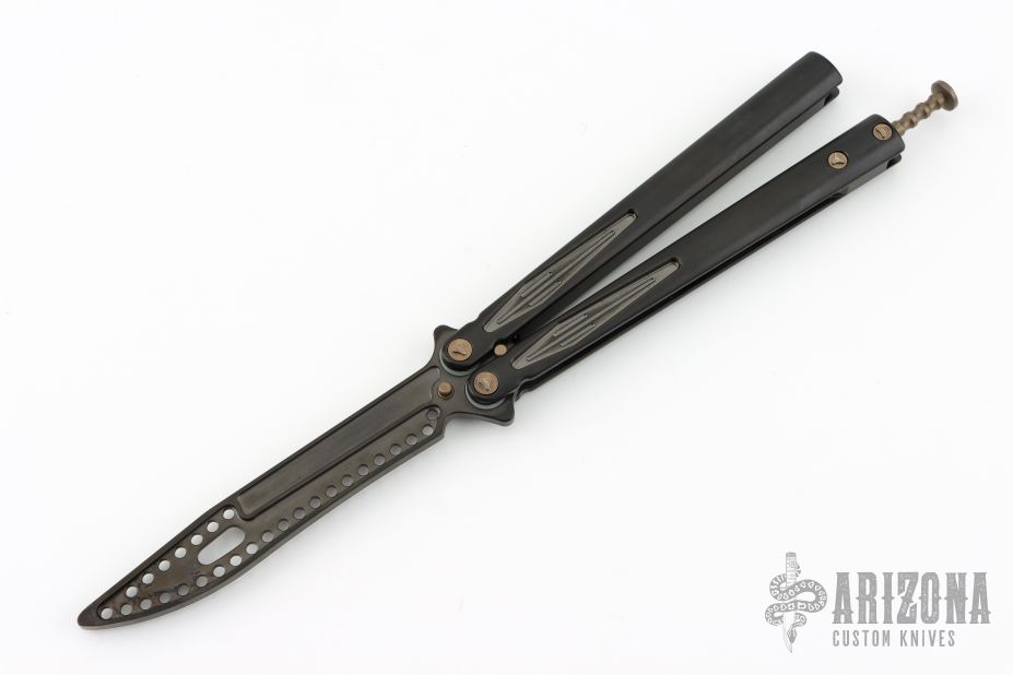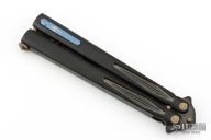 This Tachyon III Advanced Trainer balisong by Marfione Custom Knives has a DLC stonewash finished trainer blade. The handles are integral DLC stonewash finished titanium with spring latch and tip up retractile clip. Dated 06/16, serial number 041. Excellent condition.