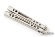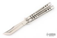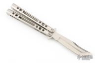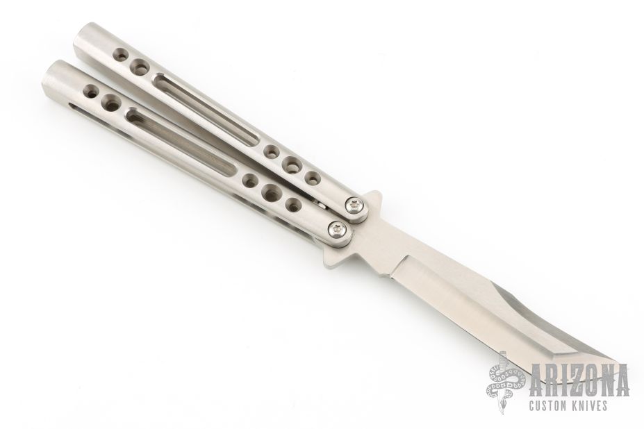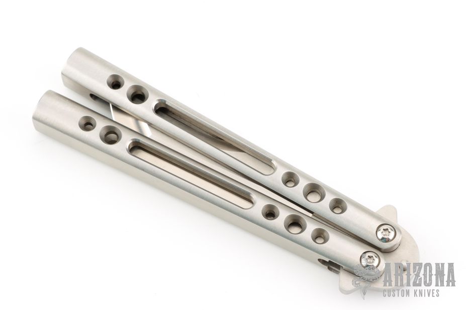 This balisong by Shawn Greacen features a satin finished tanto blade with swedge. The handle is composed of satin finished stainless steel channel construction handles. Excellent condition.