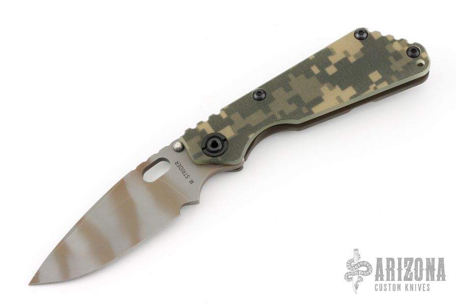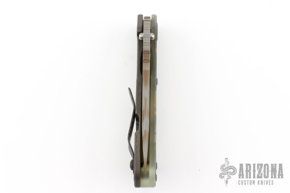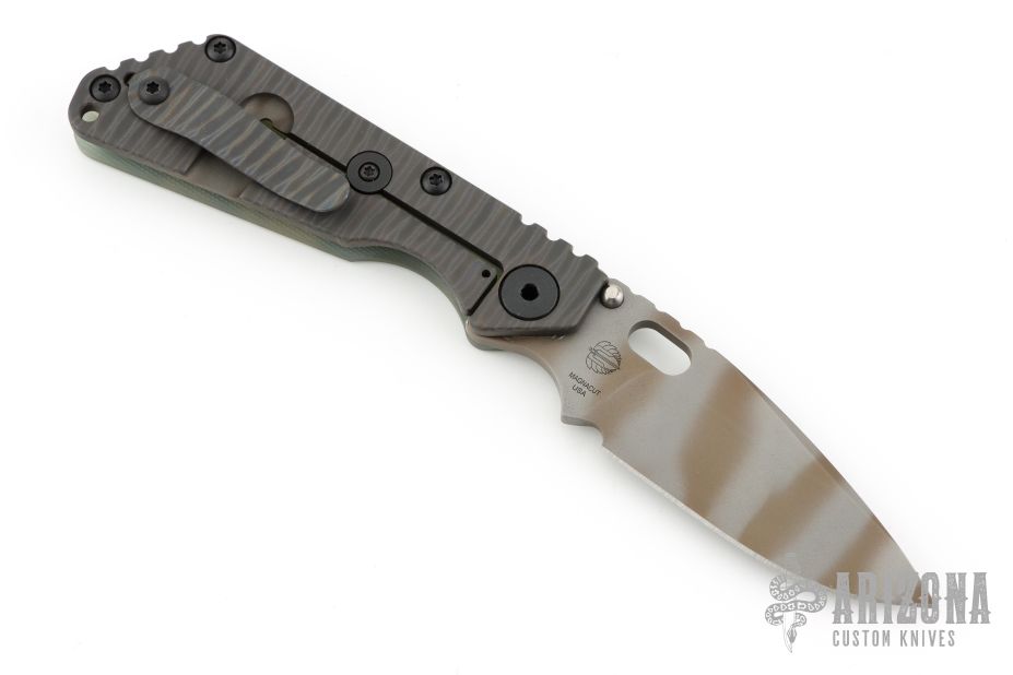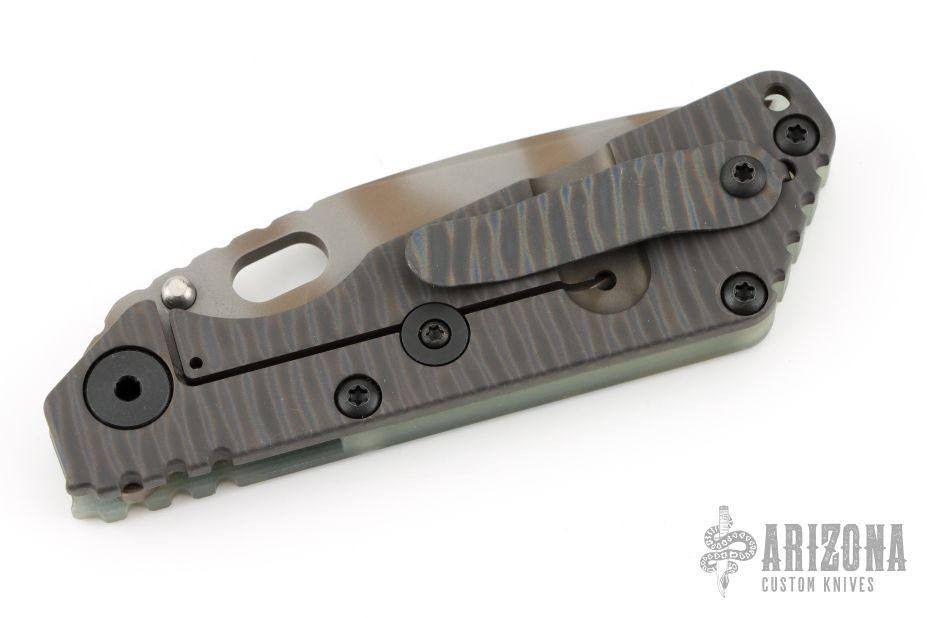 This SNG framelock folder by Mick Strider features a ghost stripe blade. Has an ACP G-10 and flamed titanium frame and tip up titanium clip. Includes a "Lock Bar Stabilizer" for maximum reverse lock retention. Nice detent, lockup and blade seating. New condition.