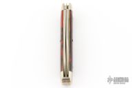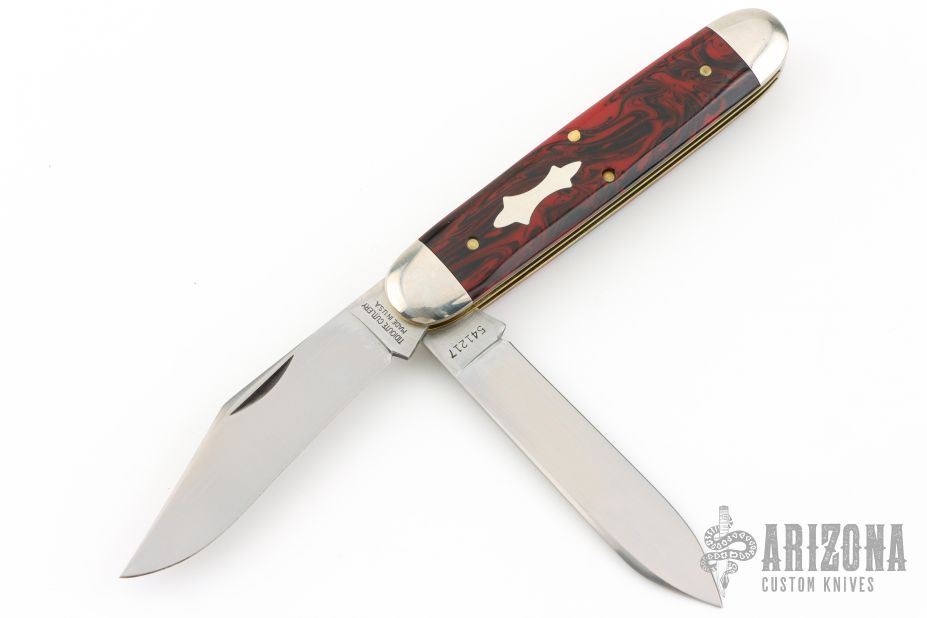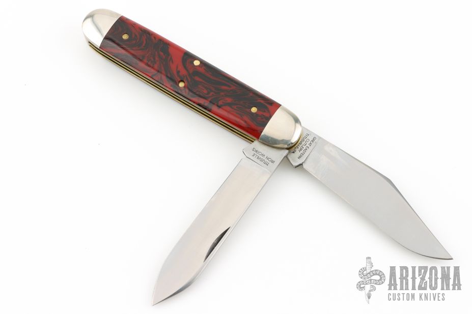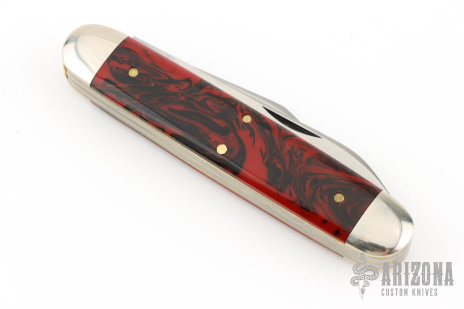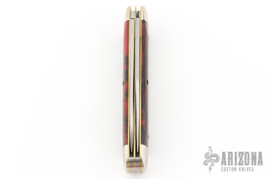 This slipjoint from Great Eastern Cutlery features two satin finished blades with nail nicks. The handle has nickel silver bolsters, Acrylic covers with brass liners, and steel springs. Has half-stops. Includes original tube and wax paper. Excellent condition.