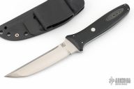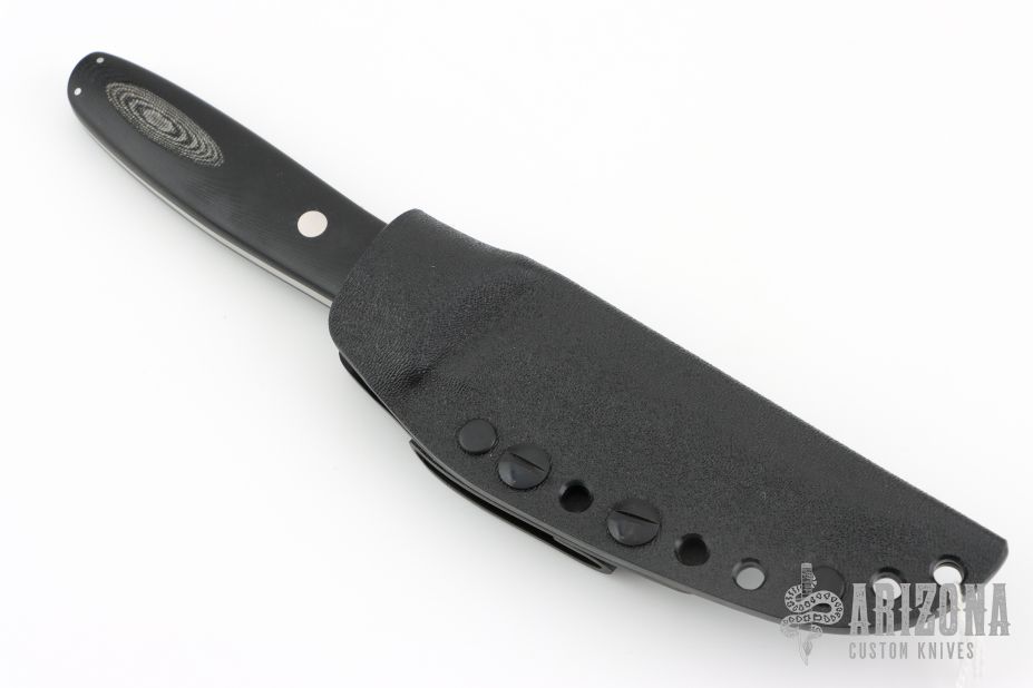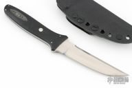 This Tanto by Bob Lum features a hand rub satin finished upswept tanto blade with .174" blade stock and .885" blade depth, full tapered tang construction. The handle has black G-10 scales with stainless pins. Comes with a kydex sheath. Has a couple extremely light scratches, otherwise excellent condition.