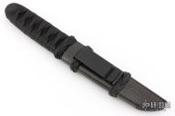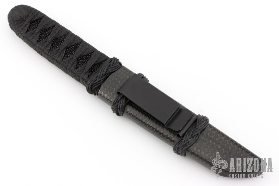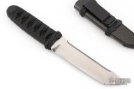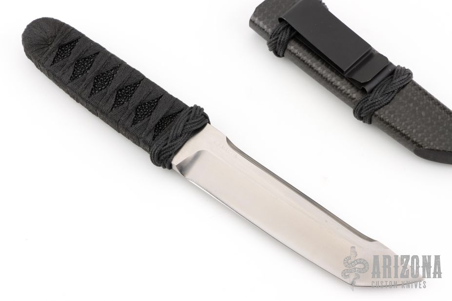 This Tanto by RJ Martin features a satin finished chisel ground tanto blade with swedge on the spine, .236" blade stock and 1.185" blade depth, hidden tang construction. The handle has black stingray skin under black epoxied cord wrap. Comes with a carbon fiber covered wood sheath.  Excellent Condition.