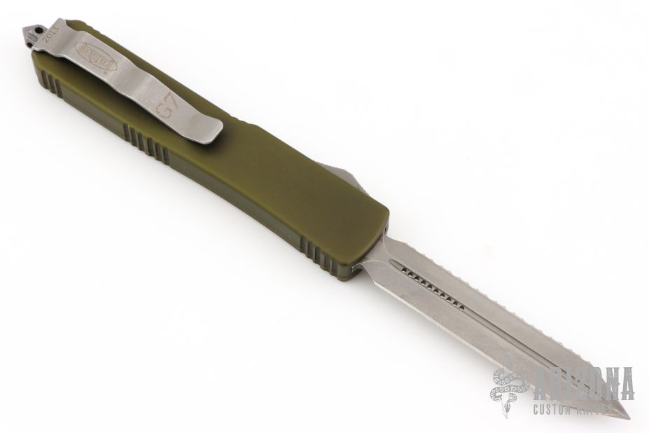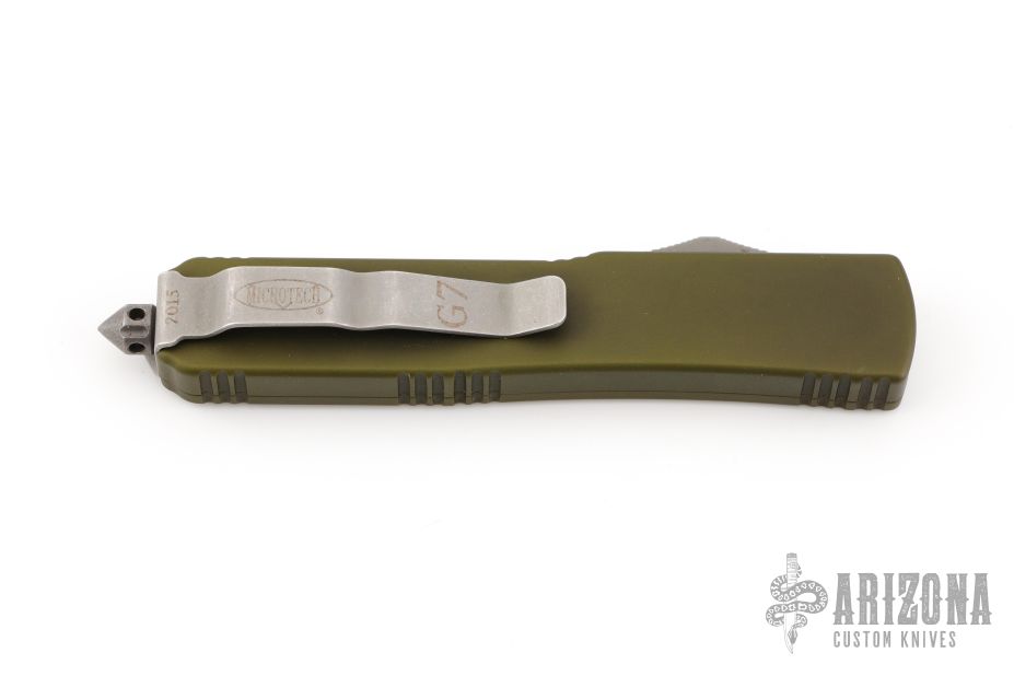 This knife from Microtech was the 2015 USN G7 Show Special. It has a double edged tanto blade with an Apocalyptic finish and a fully serrated edge, blood grooves and holes in blade. The handle is green aluminum with a tip down Apocalyptic finished stainless clip and glass breaker at the butt. Comes with original box. Has a couple light scuffs, otherwise excellent condition.