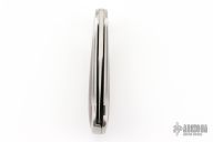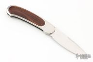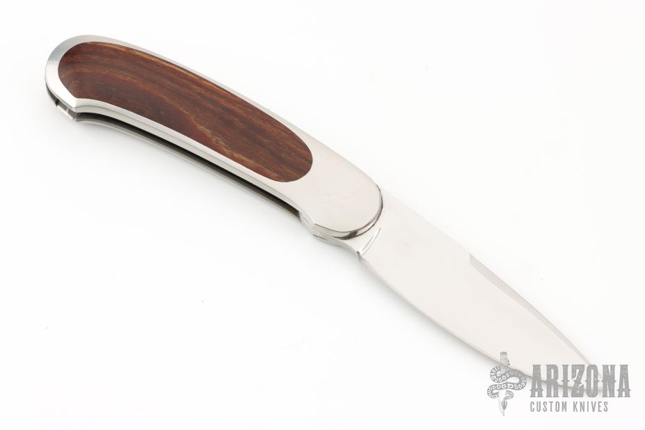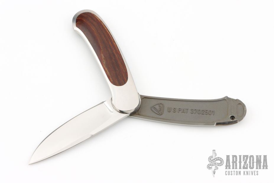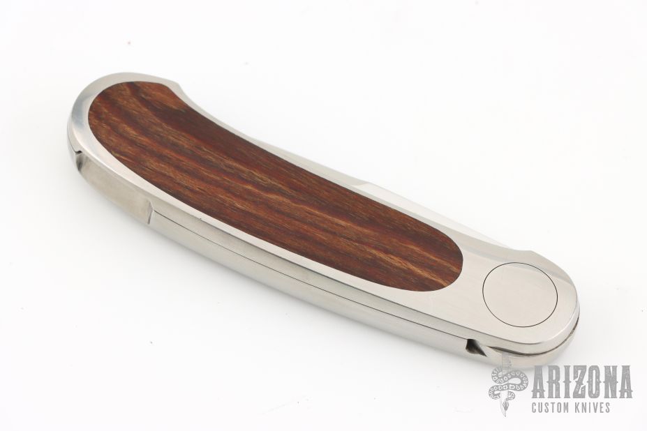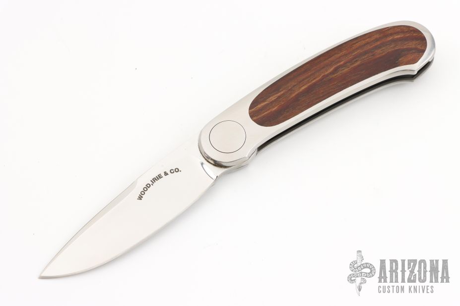 This knife by Mike Irie and Barry Wood features a mirror polished blade. The handle has satin finished stainless steel handle with wood inlays. Opens and closes like any other swing lock folder. Has some light scratches, otherwise excellent condition. US PAT 3702501 inside the frame. "#039402" and "#3 bw" hand signed on the inside of the frame on the otherside.