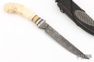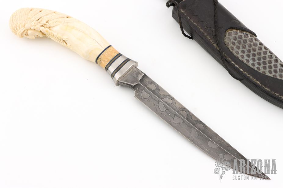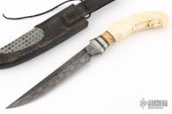 This Steirer Eisen designed drop point hunter/utility by Boker has sculpted canvas micarta scales for a solid grip with a brushed stainless guard, pins, and lanyard tube. It has a mirror polished blade with satin flats, full tang construction with thickness of .141" and depth of 1.348". Comes with original brown leather sheath. #788. Excellent condition.