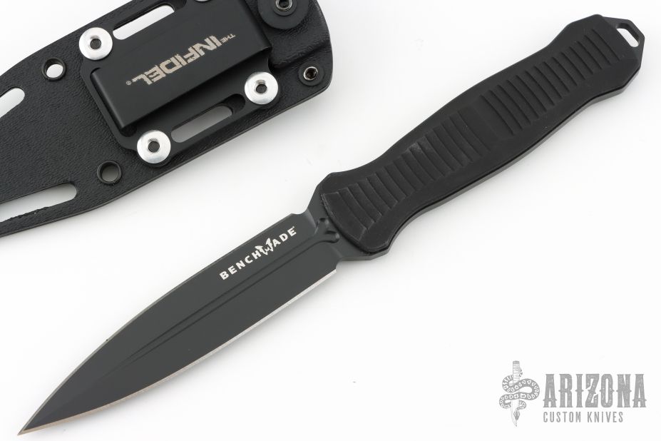 The Benchmade 133BK Fixed Infidel is a full-tang tactical fixed blade designed after the iconic Benchmade Infidel out-the-front knife. Its double-edged blade is made from resilient D2 tool steel in a black coating. Grooved, black anodized aluminum scales provide absolute grip security. Includes a Tek-Lok compatible Boltaron sheath.