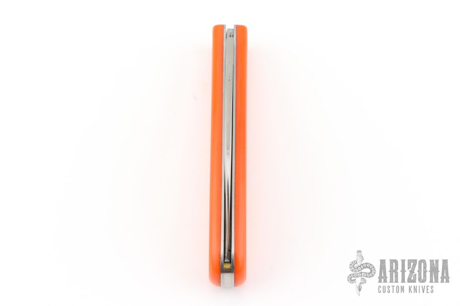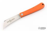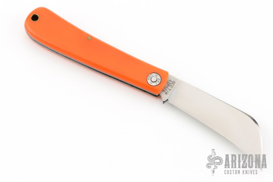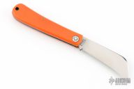 This Harvester from Great Eastern Cutlery features a satin finished hawkbill style blade with swedge. The handle has Delrin covers, steel liners, and stainless steel spring, lanyard hole at butt. Has Half-stop. Comes with tube and wax paper. Excellent condition.