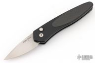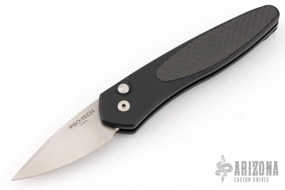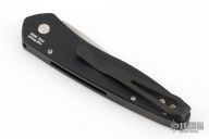 This Half Breed by Pro-Tech has a stonewashed blade with swedge. The handle has a black aluminum frame with carbon fiber inlay and a black stainless steel pocket clip. Excellent condition. Comes with original box and papers.