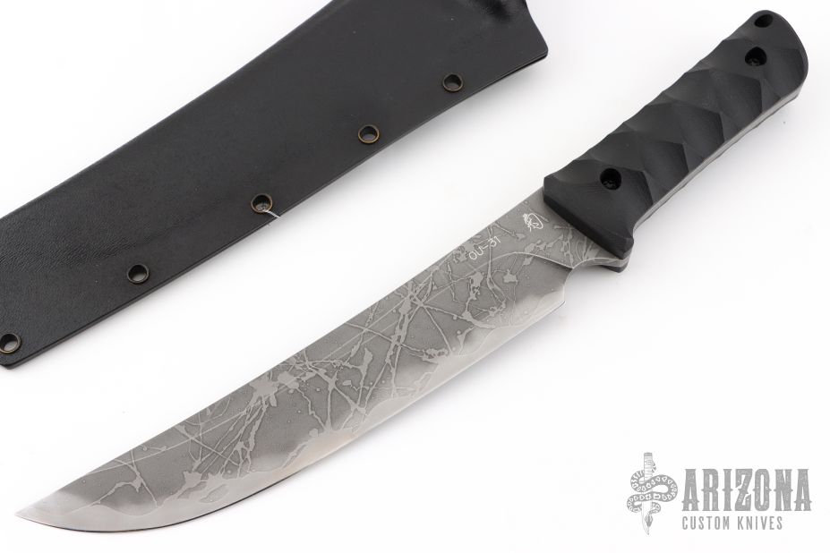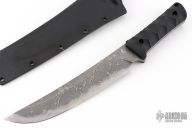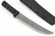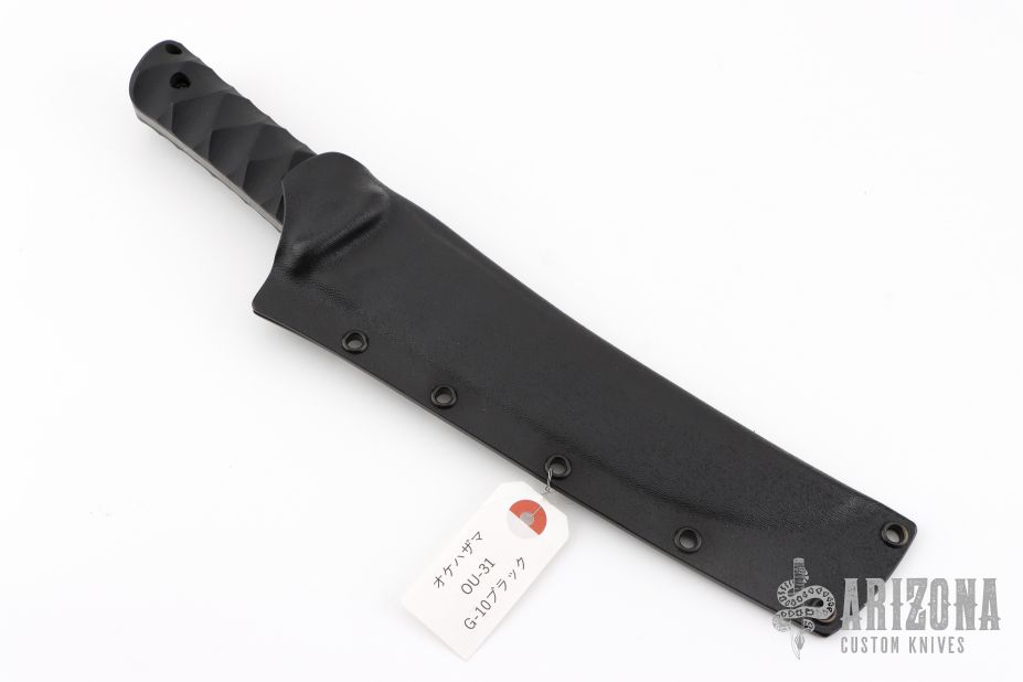 The "OKEHAZAMA" by Kiku Matsuda features a heavy duty upswept OU-31 Hamaguri-ba Tanto blade with taper grind on back and a sharp Kissaki tip, .217" blade stock and 1.549" blade depth, full tang construction with hand contoured black canvas micarta scales. Comes with hand fitted "SUNLOID KD" sheath. SUNLOID KD is an Acrylic-PVC Alloy Plate made by SUMITOMO BAKELITE. Excellent condition.