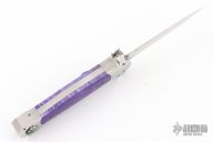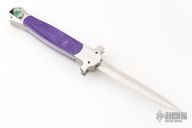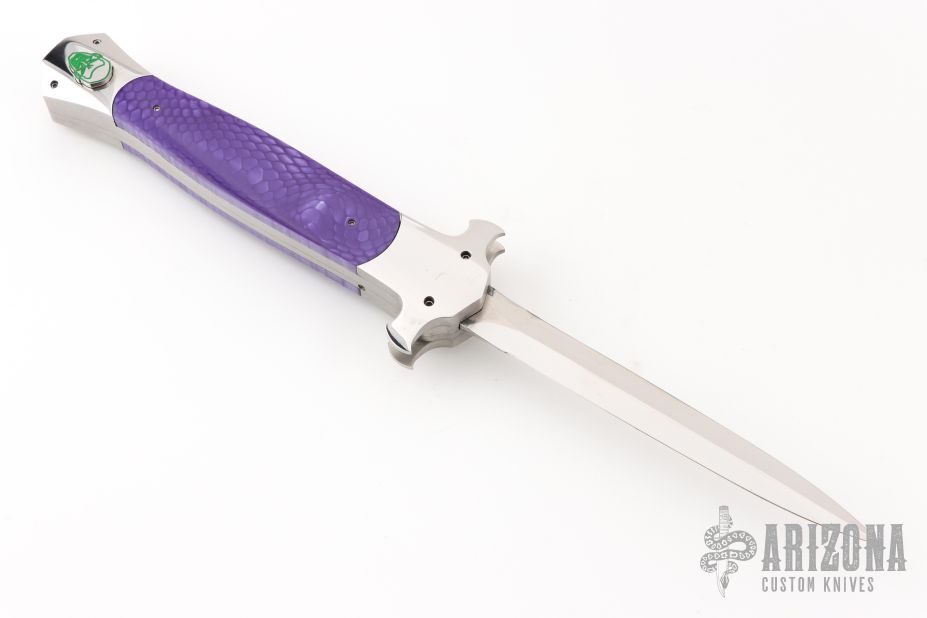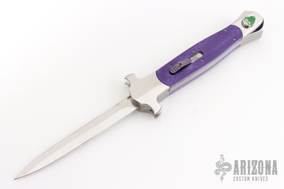 This Custom Hammer Head OTF by Burn Knives features a mirror polished double-edged blade. The handle has a mirror polished 416 stainless steel frame with Purple Juma Snakeskin scales. Has 3d milled Joker logos in rear bolsters. Anodized titanium button. Nice action and lockup. Excellent condition. Comes with COA dated 3-30-20. Comes with a zippered case.