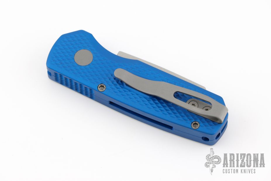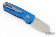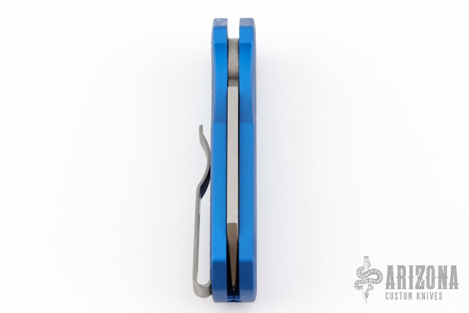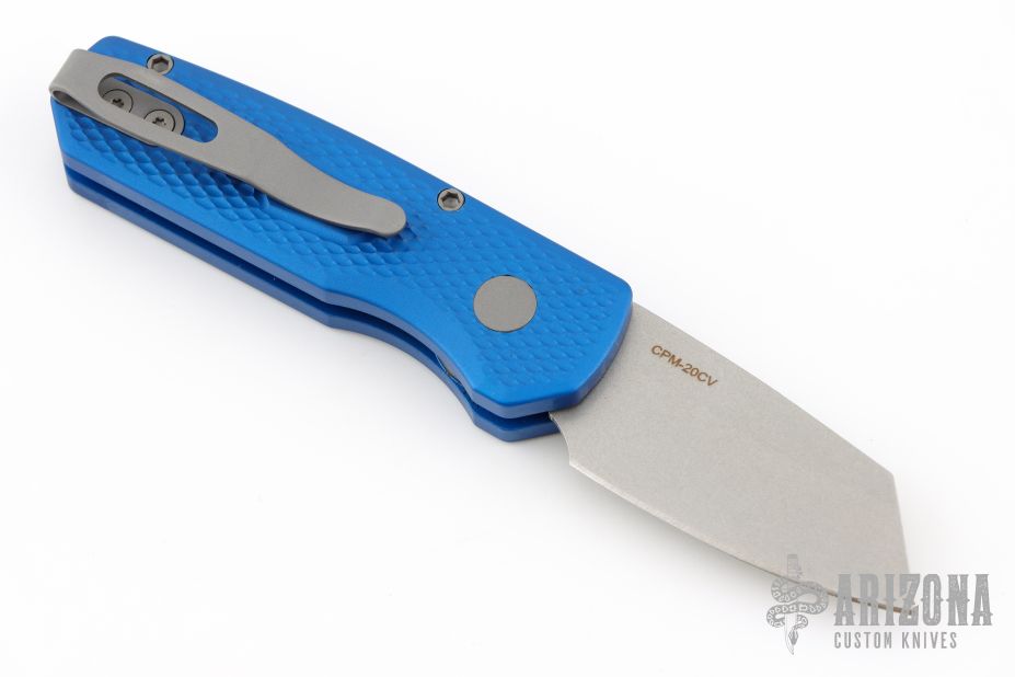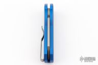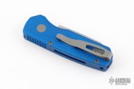 The Runt 5 by Pro-Tech Knives features a tumbled sheepsfoot style blade.  The handle features a blue milled aluminum handle with a bead blast finished tip up stainless steel pocket clip. Comes with original box, pouch and papers. Excellent condition.