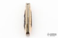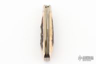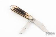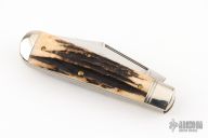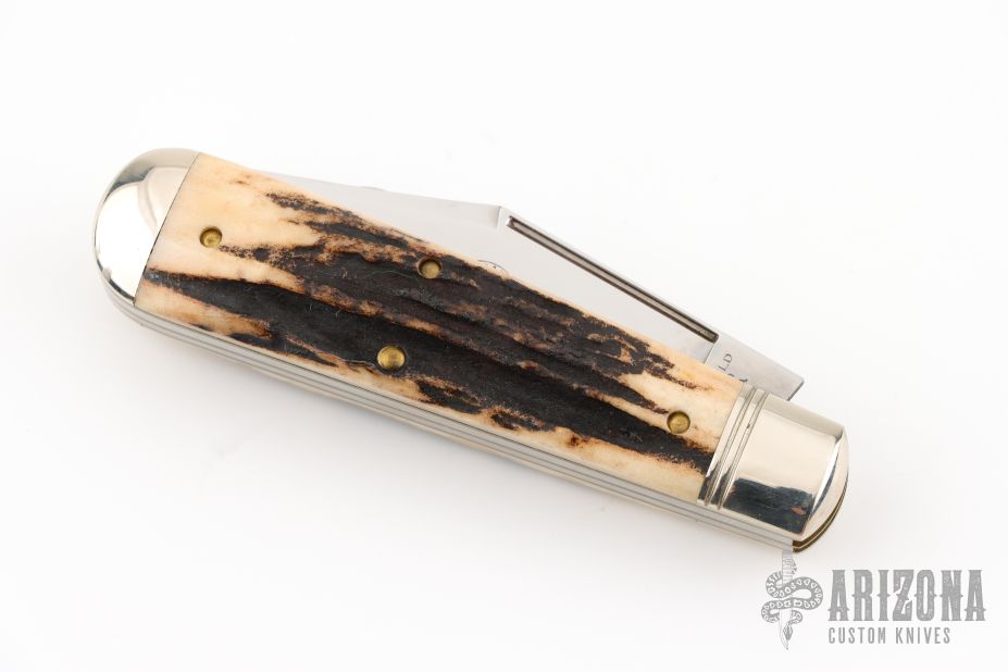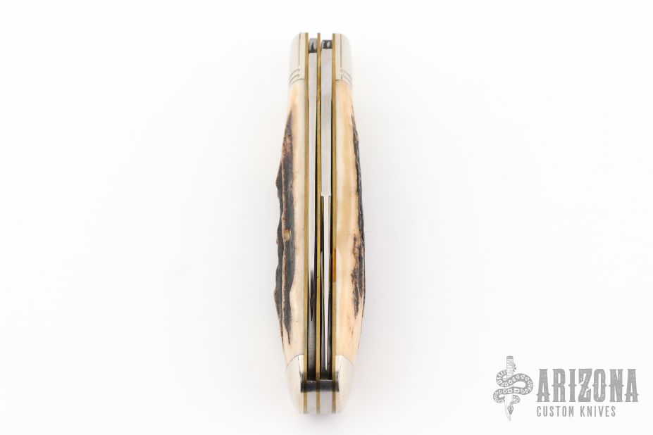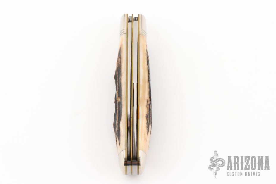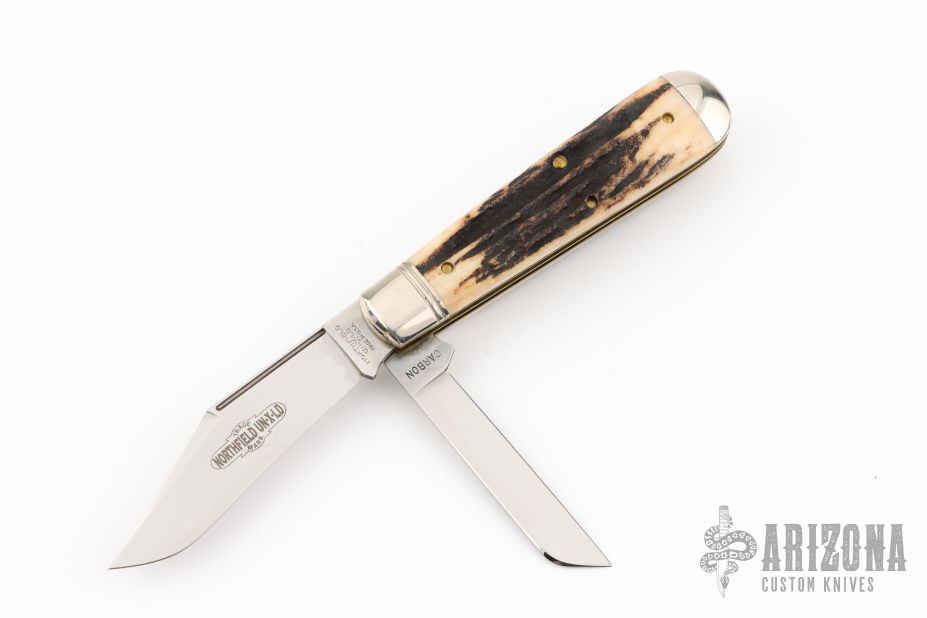 This slipjoint from Northfield features 2 mirror finished blades with nail nicks. The handle has nickel silver bolsters, sambar stag covers with brass liners, and steel springs. Includes original packaging. Excellent condition.