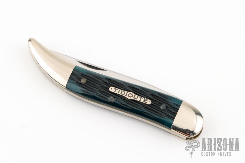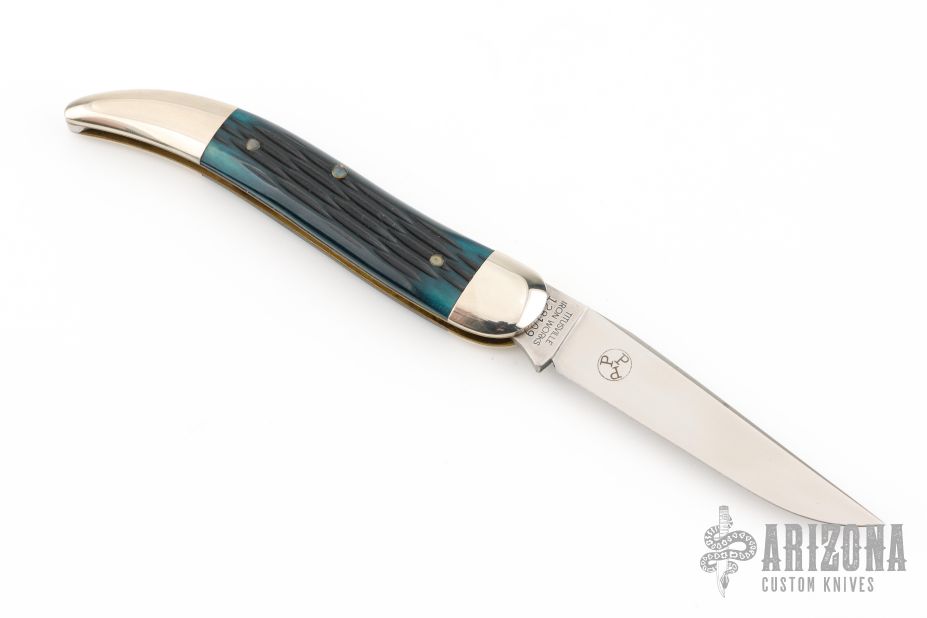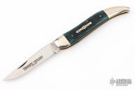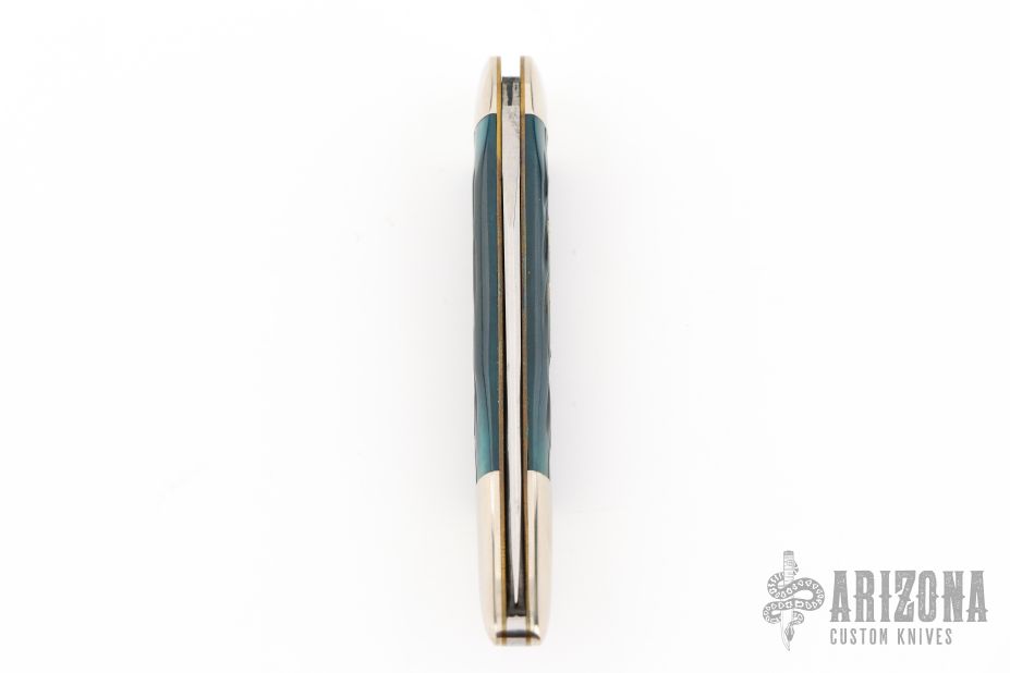 This Toothpick by Great Eastern Cutlery features a satin finished blade with nail nick. The handle has nickel silver bolsters, escutcheon, river blue jigged bone covers, brass liners, and a stainless spring. Comes with original tube. Excellent condition.