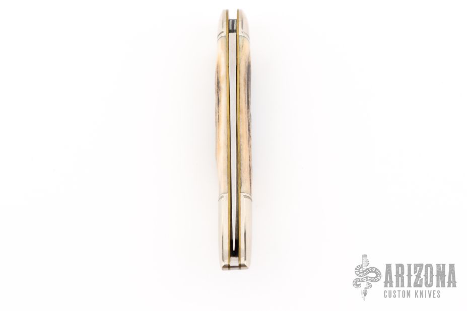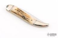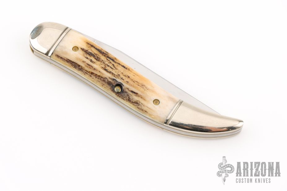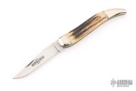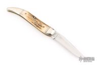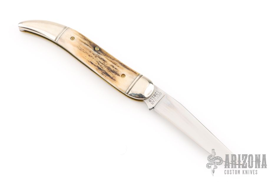 This Toothpick by Great Eastern Cutlery features a mirror finished blade with nail nick. The handle has nickel silver bolsters, sambar stag covers, brass liners, and a stainless spring. Comes with original tube. Excellent condition.