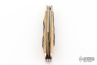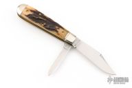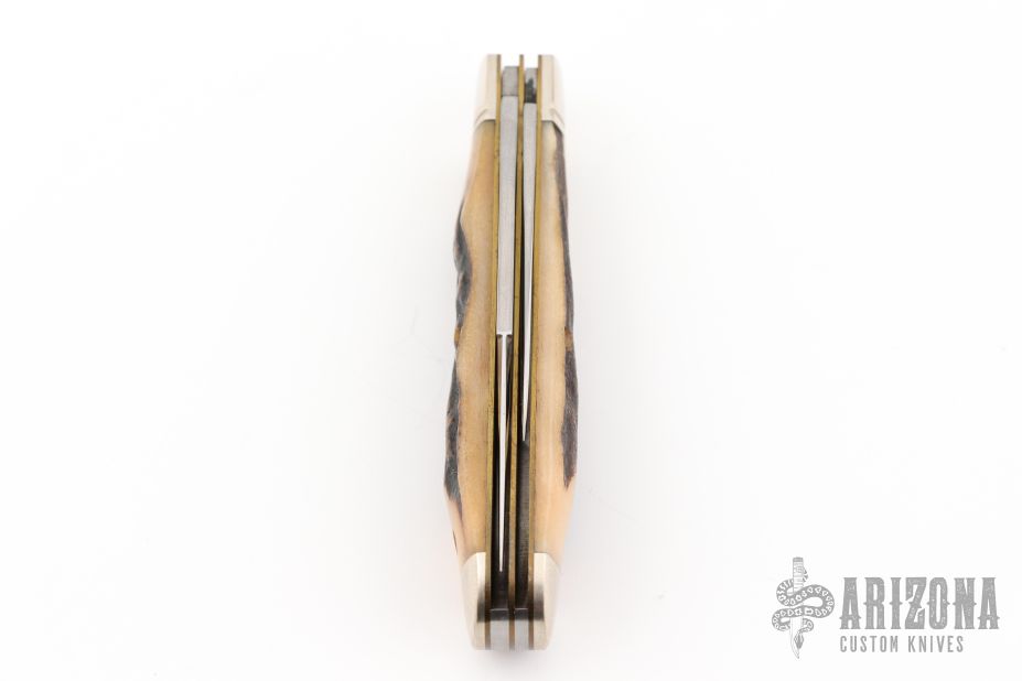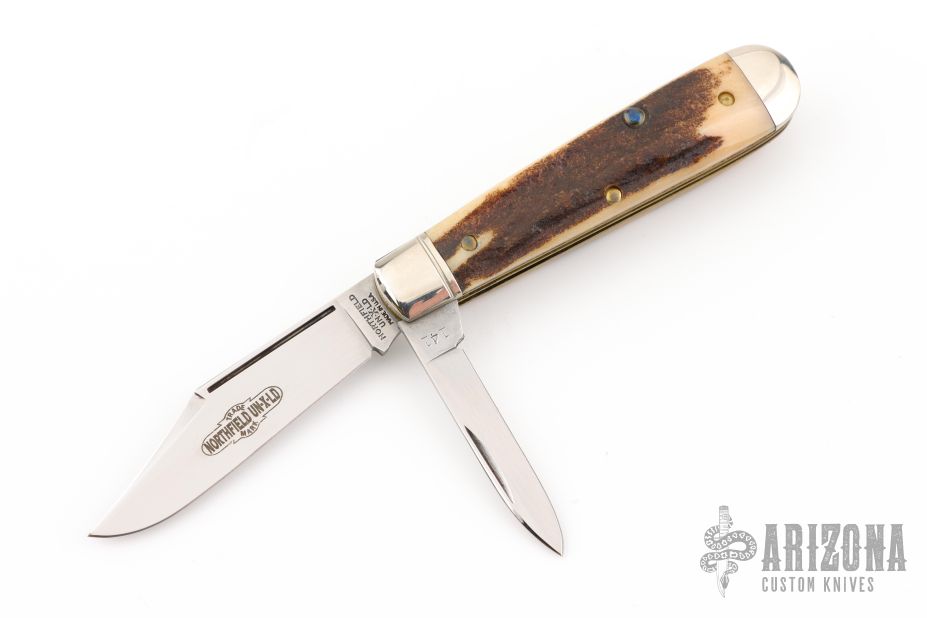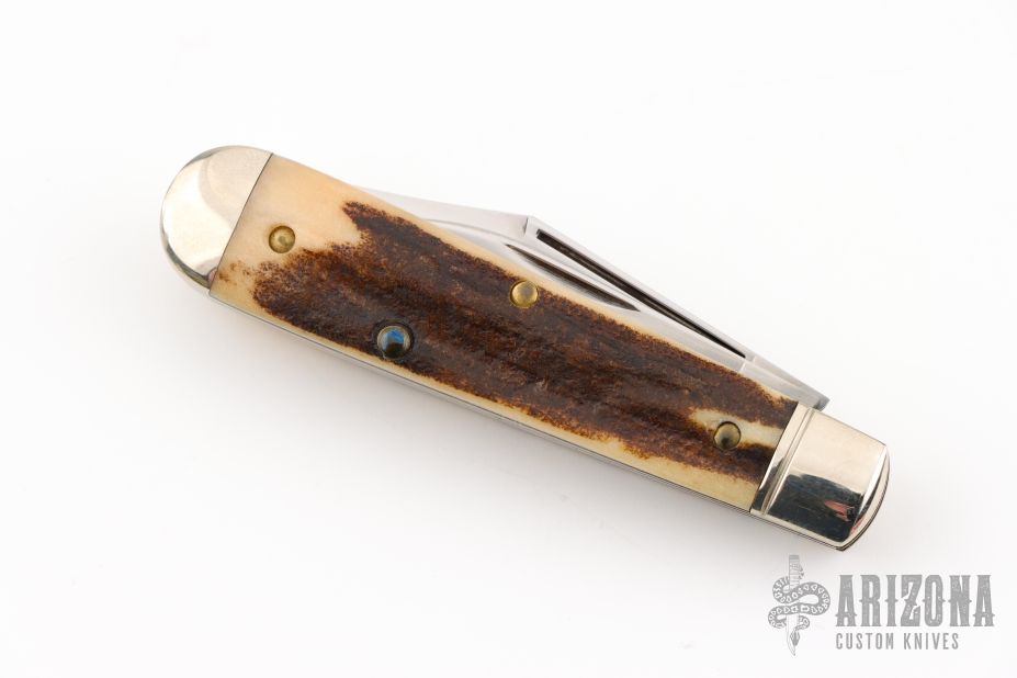 This slipjoint by Great Eastern Cutlery features a satin finished blades with nail nicks. The handle has fluted nickel silver bolsters, sambar stag covers with brass liners/pins, steel spring. Has half-stops. Comes with original tube. Excellent condition.