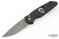 This Tactical Response TR-3 by Pro-Tech black anodized aluminum body, which provides good traction and looks great. The blade is acid wash finished 154-CM stainless steel with a plain cutting edge. The TR-3 is a knife that won't let you down. It fires hard, locks up like a rock, and feels great in hand. The slim design sits comfortably for tip-up pocket carry. Bead blast finished firing button, adding a unique and awesome flare to the piece. Sterling Silver Skull in handle. Comes with original box and papers. Excellent condition. #14