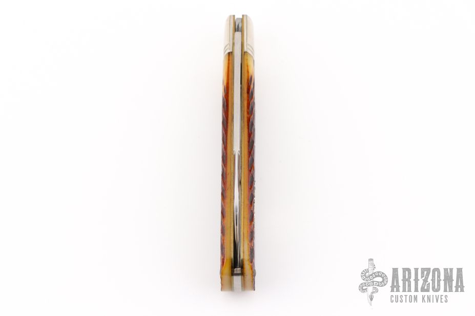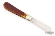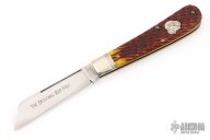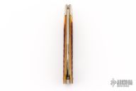 This Swayback by Great Eastern Cutlery features mirror finished wharncliffe blade with nail nick. The handle has fluted nickel silver bolsters, Antique Autumn Jigged Bone covers with a nickel silver, brass pins and liners, stainless steel spring. Has half-stop. Comes with original tube. Excellent condition.