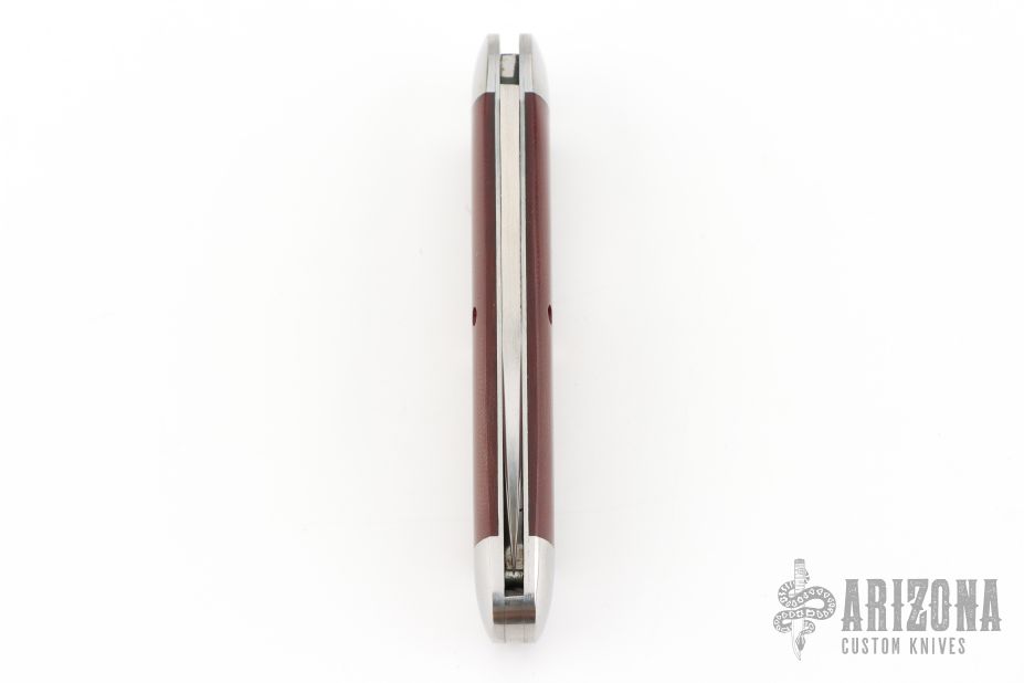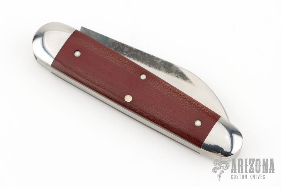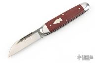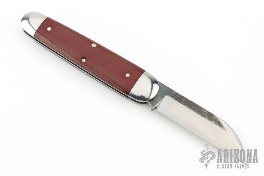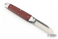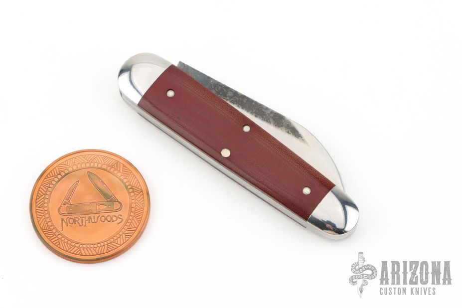 This Northwoods Knives Fremont Jack features a wharncliffe style blade with swedge and long pull. The handle is comprised stainless steel bolsters, micarta covers over stainless steel liners and spring, nickel silver escutcheon. Excellent condition. Comes with leather slip sheath and coin.
