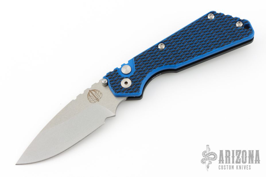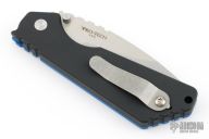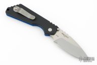This Pro-Strider PT by Pro-Tech and Strider Knives features a stonewashed 154CM blade with a notched thumbrest. The handle has a textured blue/black g10 scale, a and black aluminum frame with stonewashed stainless steel tip up clip. Comes with original box, pouch and papers. Excellent condition.