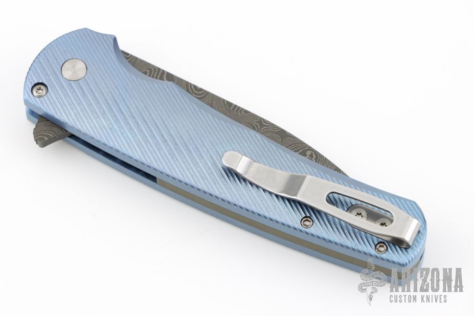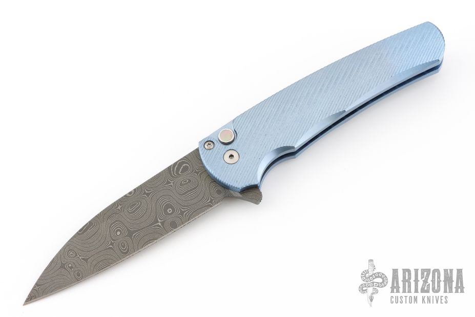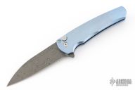 This Malibu by Pro-Tech features a Chad Nichols Damascus blade with flipper. The handle has a milled and anodized titanium frame with mother of pearl inlaid push button, green G-10 backspacer and a stainless steel tip up clip. Comes with original box, pouch and papers. Excellent condition.