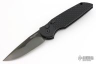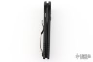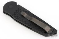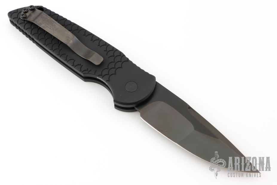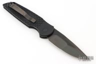 This Tactical Response TR-3 X1 Operator Series features a "Fish Scale" milled, black anodized aluminum body, which provides good traction and looks great. The blade is black DLC finished 154-CM stainless steel with a hand ground compound grind. The TR-3 is a knife that won't let you down. It fires hard, locks up like a rock, and feels great in hand. The slim design sits comfortably for tip-up pocket carry. Comes with original box, pouch and papers. Excellent condition. Marked "prototype" on the frame.