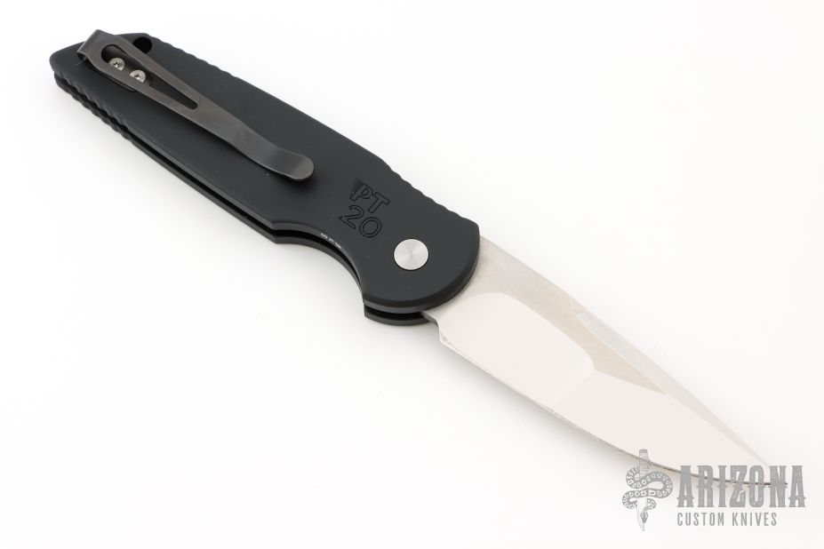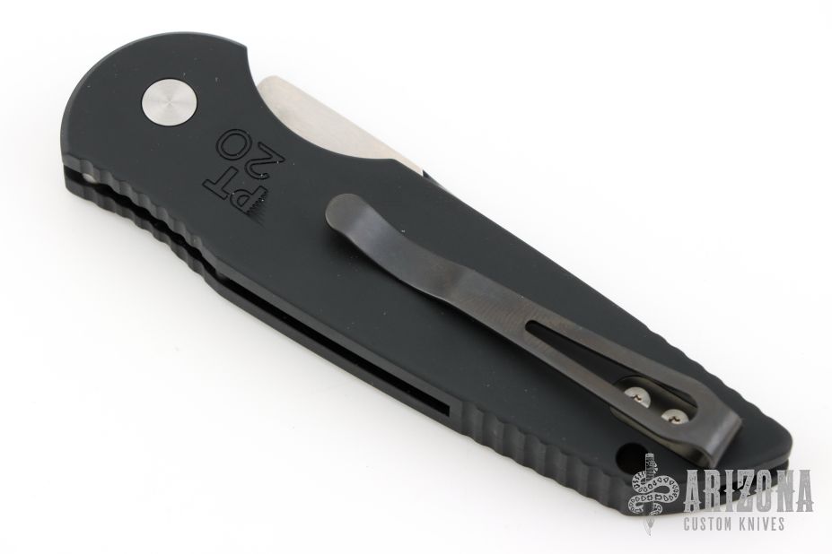 Protech is commemorating 20 years in business with a special Elite limited edition series of knives. This TR-3 model features a knurl textured handle with a mother of pearl push button and a "PT 20" engraving on back that commemorates 20 years of Protech quality. Item includes a compound grind, mirror finished S35VN steel blade and a deep carry pocket clip. This Tactical Response TR-3 features a black textured aluminum body, which provides good traction and looks great. The TR-3 is a responsive automatic knife that won't let you down. It fires hard, locks up like a rock, and feels great in hand. The slim design sits comfortably for tip-up pocket carry.