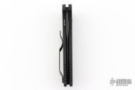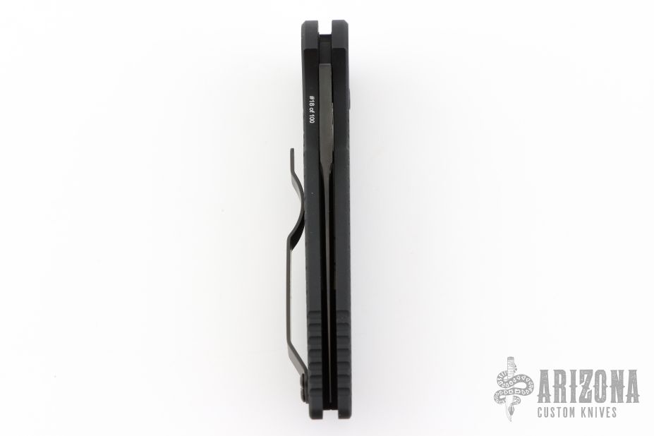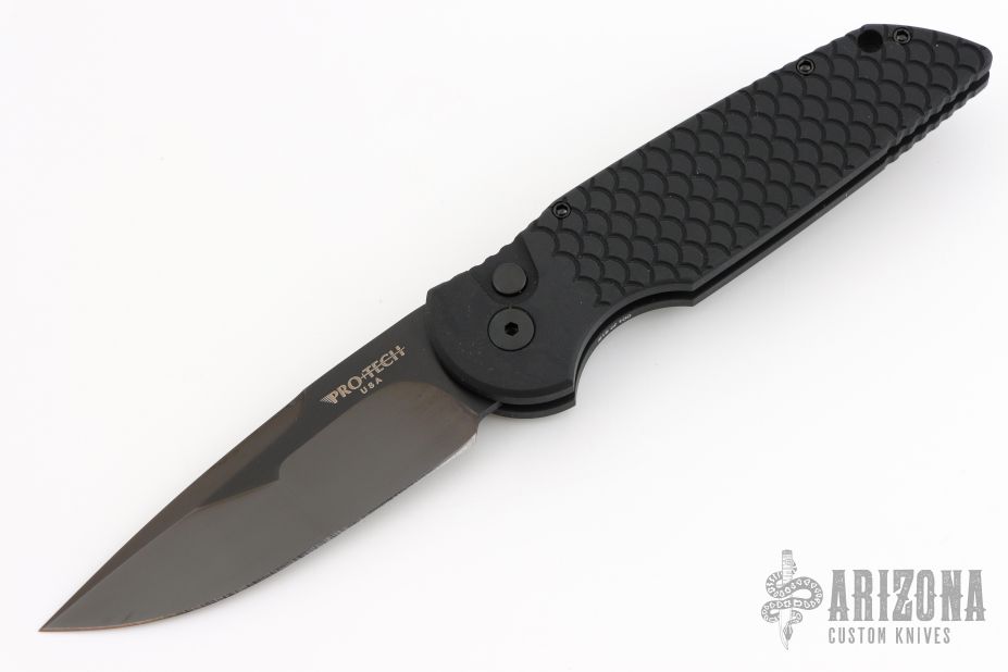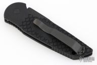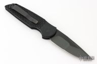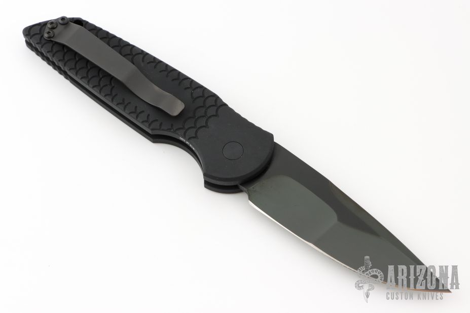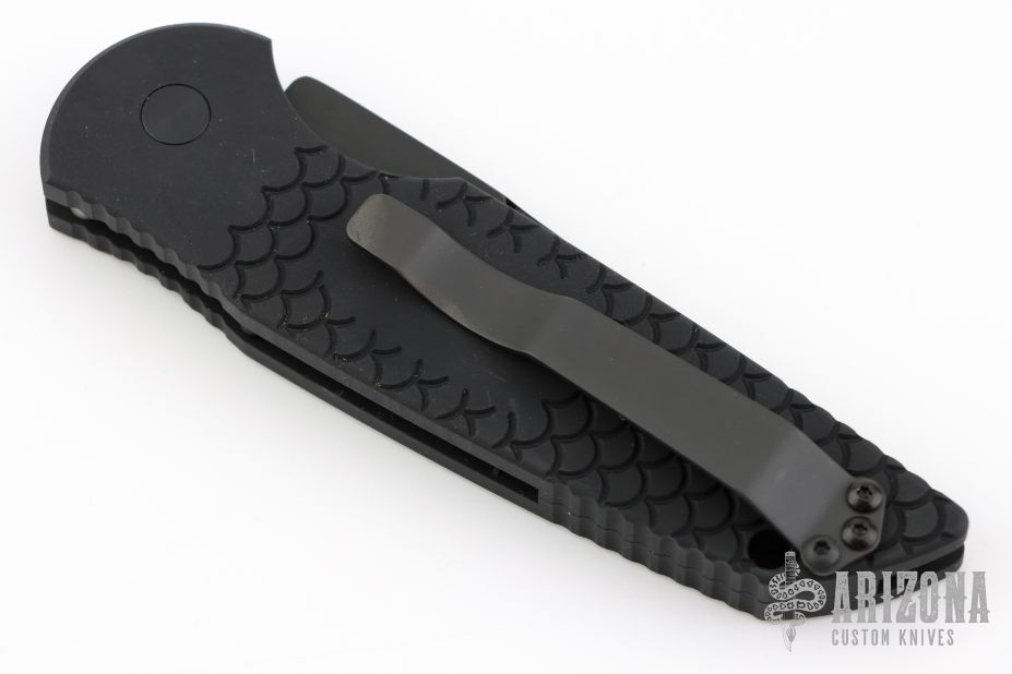 This Tactical Response TR-3 by Pro-Tech features a "Fish Scale" milled, black anodized aluminum body, which provides good traction and looks great. The blade is black mirror finished DLC stainless steel with a hand ground compound grind done by Mike Irie. The TR-3 is a knife that won't let you down. It fires hard, locks up like a rock, and feels great in hand. The slim design sits comfortably for tip-up pocket carry.