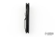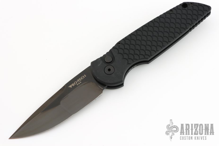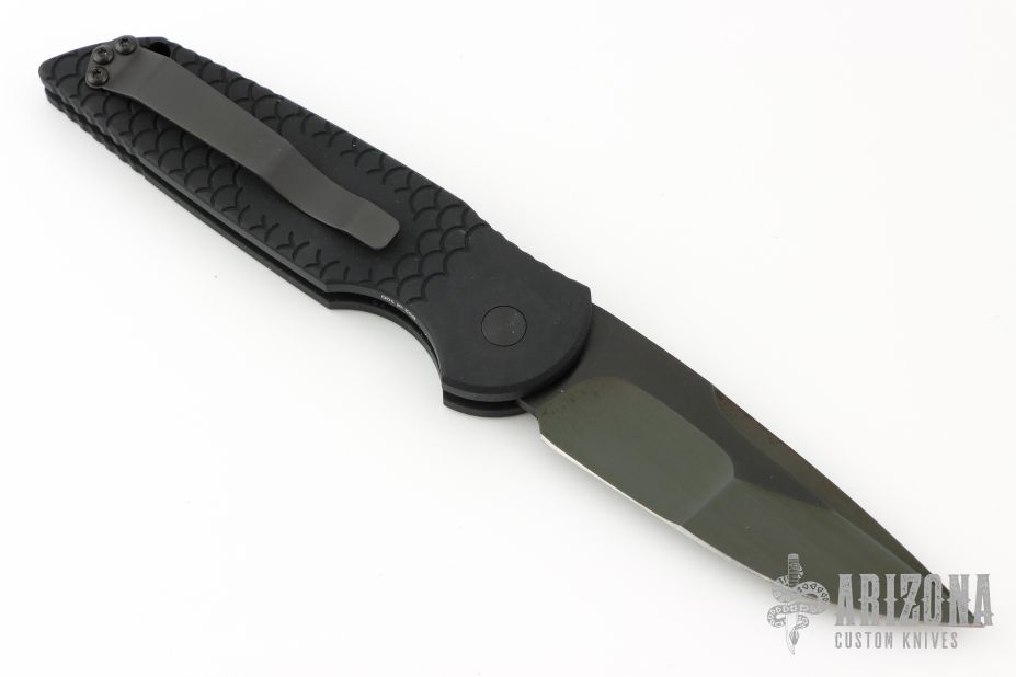 This Tactical Response TR-3 by Pro-Tech features a "Fish Scale" milled, black anodized aluminum body, which provides good traction and looks great. The blade is black mirror finished DLC stainless steel with a hand ground compound grind done by Mike Irie. The TR-3 is a knife that won't let you down. It fires hard, locks up like a rock, and feels great in hand. The slim design sits comfortably for tip-up pocket carry.