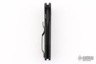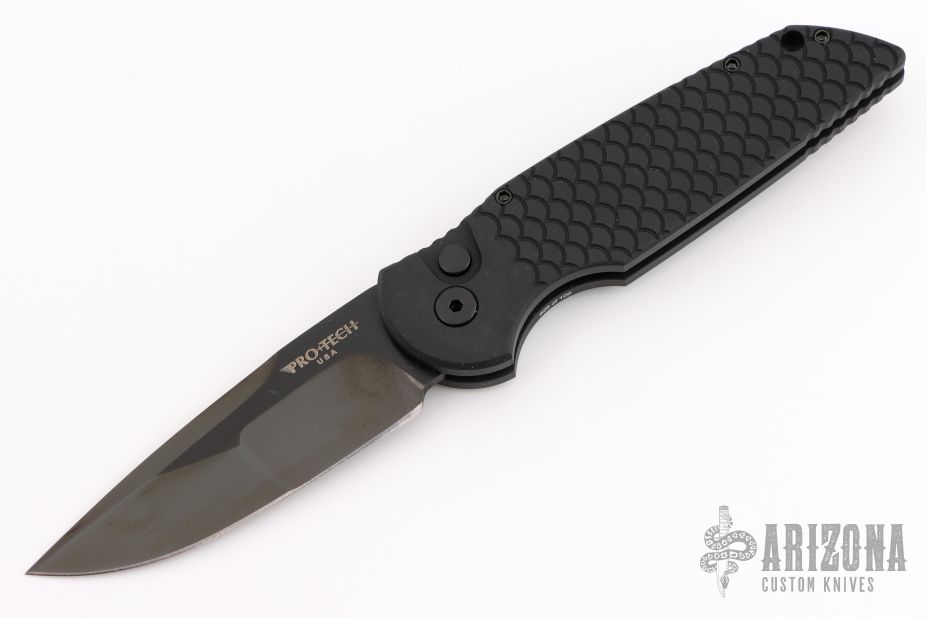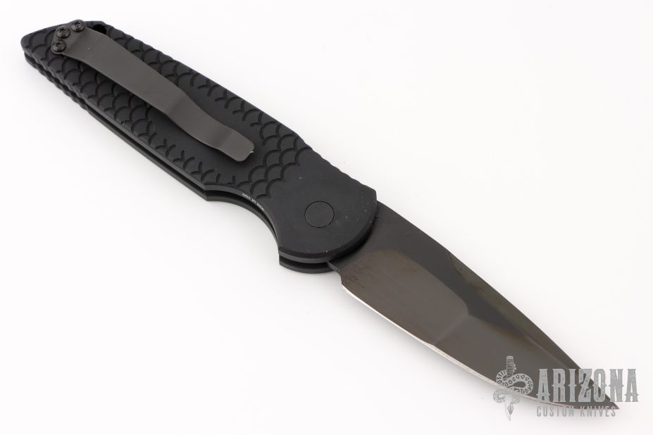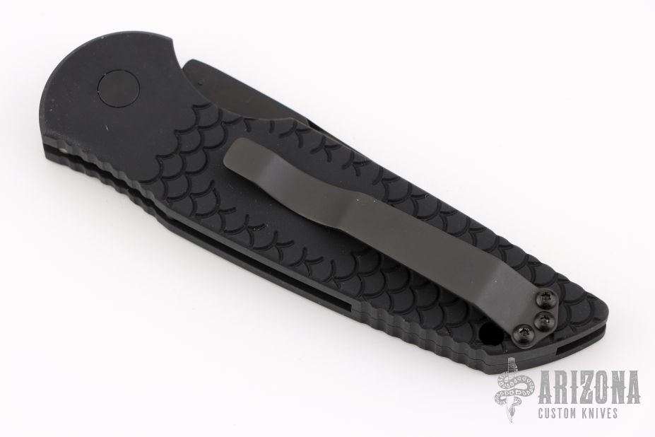 This Tactical Response TR-3 by Pro-Tech features a "Fish Scale" milled, black anodized aluminum body, which provides good traction and looks great. The blade is black mirror finished DLC stainless steel with a hand ground compound grind done by Mike Irie. The TR-3 is a knife that won't let you down. It fires hard, locks up like a rock, and feels great in hand. The slim design sits comfortably for tip-up pocket carry.