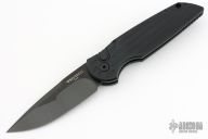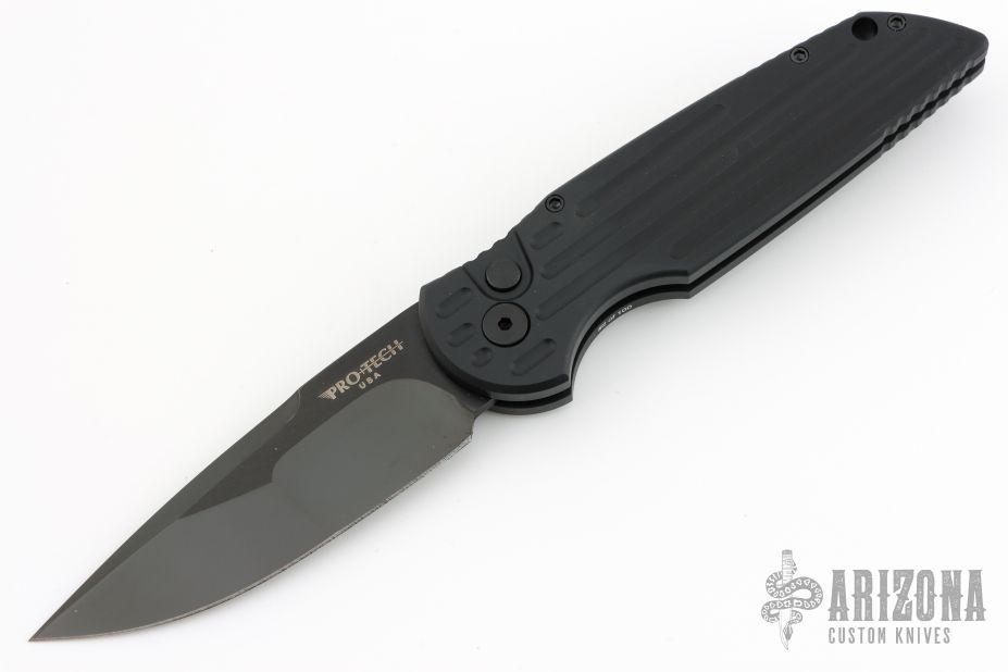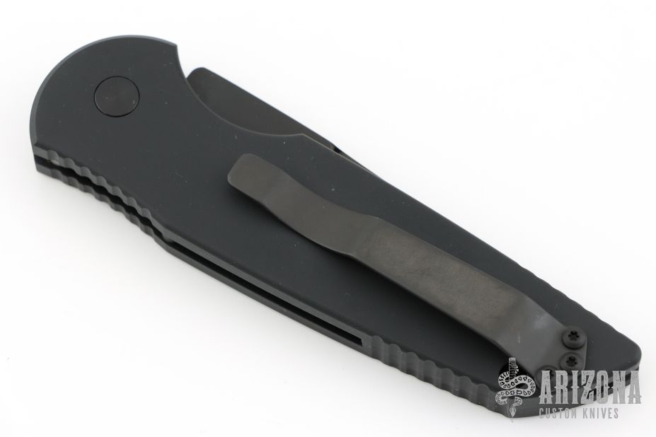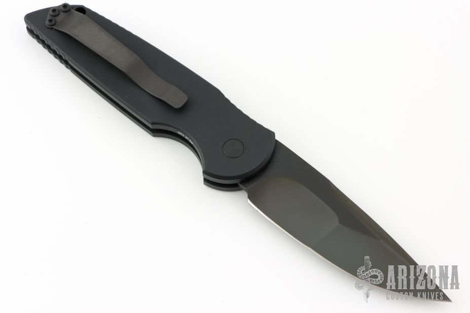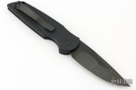 This Tactical Response TR-3 by Pro-Tech features a "Grooves" milled, black anodized aluminum body, which provides good traction and looks great. The blade is black DLC finished 154-CM stainless steel with a hand ground compound grind done by Mike Irie. The TR-3 is a knife that won't let you down. It fires hard, locks up like a rock, and feels great in hand. The slim design sits comfortably for tip-up pocket carry. Comes with original box, pouch, and papers. Excellent condition.