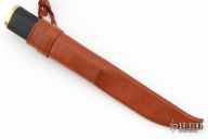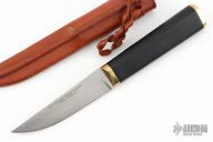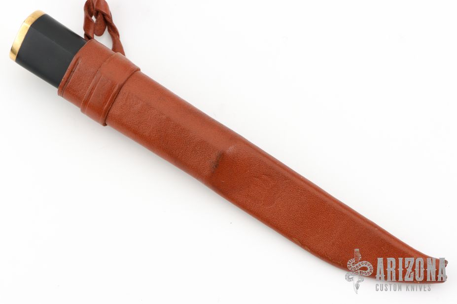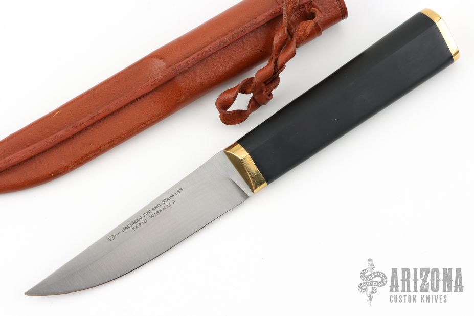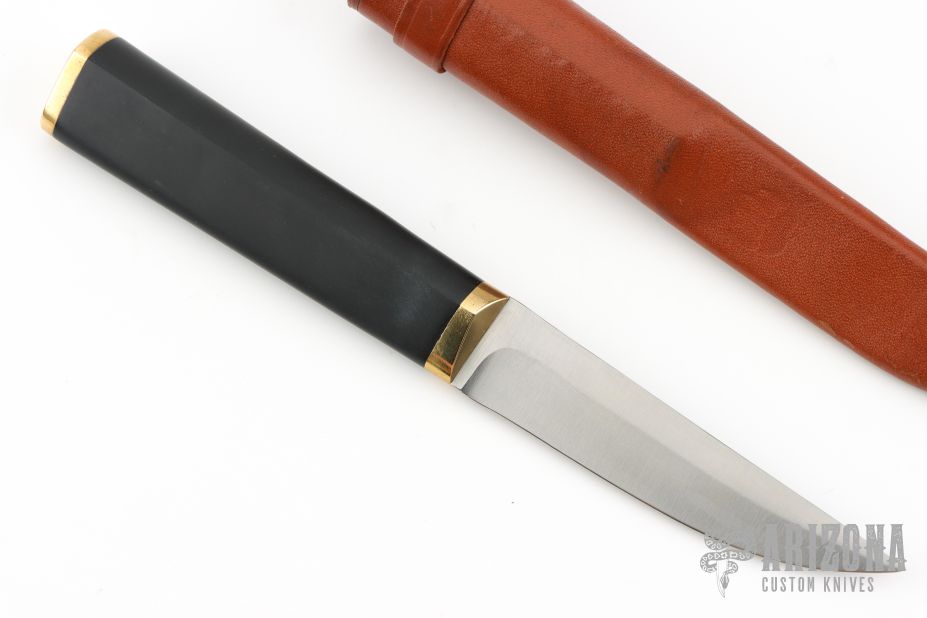 This Tapio Wirkkala Design pukko by Hackman Finland features a satin finished blade with .110" blade stock and .961" blade depth, hidden tang construction. The handle has brass bolster and butt cap and a black composite handle. Comes with original brown leather sheath. Has a couple light scratches, excellent condition otherwise.
