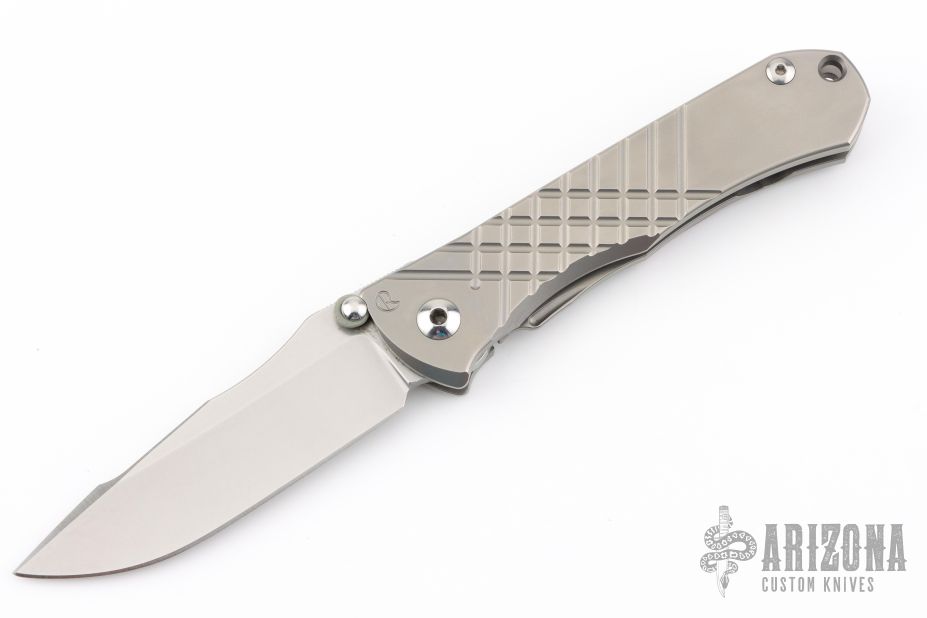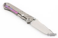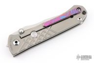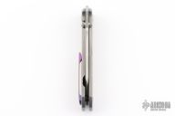 This Umnumzaan Framelock Folder by Chris Reeve Knives has a stonewashed clip point blade with dual thumb studs and notched thumbrest. The titanium handle has been custom Zirc blasted with titanium barrel spacer, custom timascus tip up clip, and lanyard hole. Nice detent, lockup and blade seating. Comes with original box, lube, tools, lanyard pin, and papers dated July 25, 2016. Has a couple light scratches, otherwise excellent condition.