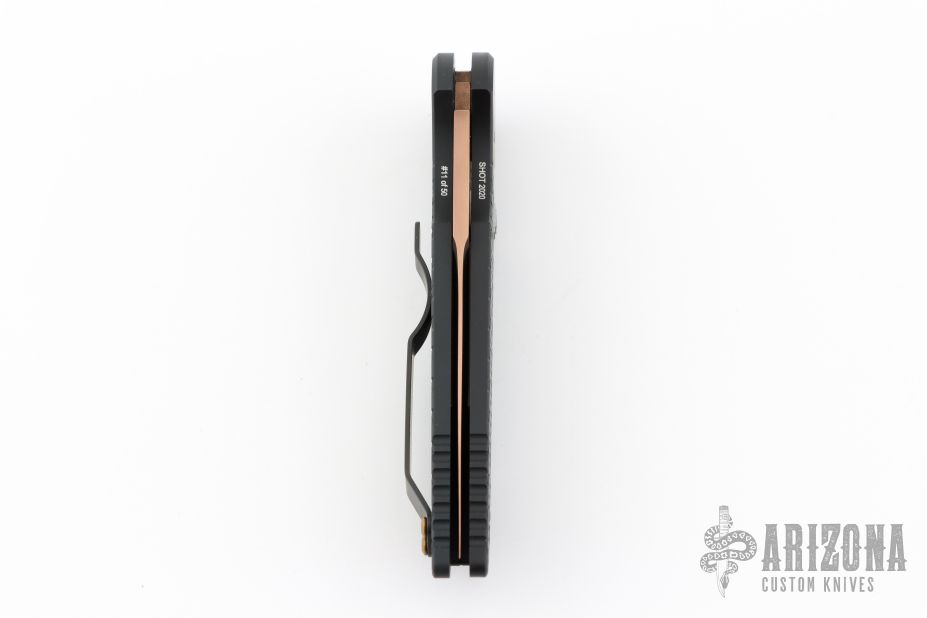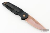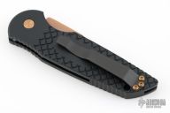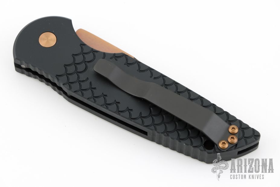 This TR-3 by Pro-Tech Knives features a fish scale textured handle with a bronzed push button and hardware. Item includes a tumbled and rose gold coated blade and a black tip up stainless steel clip. This Tactical Response TR-3 features a black textured aluminum body, which provides good traction and looks great. The TR-3 is a responsive automatic knife that won't let you down. It fires hard, locks up like a rock, and feels great in hand. The slim design sits comfortably for tip-up pocket carry. #11 of 50. From the SHOT 2020.