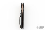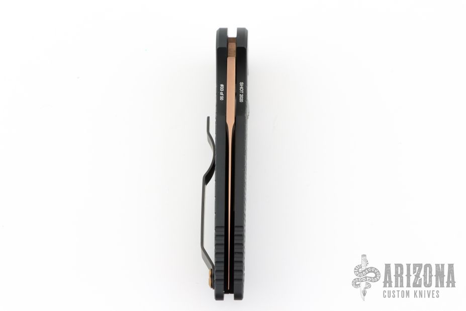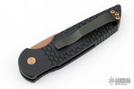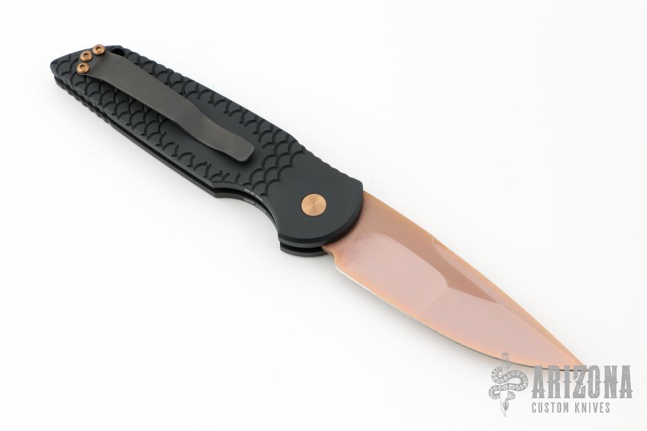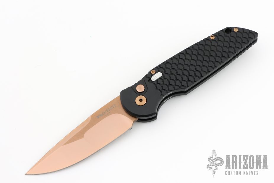 This TR-3 by Pro-Tech Knives features a fish scale textured handle with a bronzed push button and hardware. Item includes a tumbled and rose gold coated blade and a black tip up stainless steel clip. This Tactical Response TR-3 features a black textured aluminum body, which provides good traction and looks great. The TR-3 is a responsive automatic knife that won't let you down. It fires hard, locks up like a rock, and feels great in hand. The slim design sits comfortably for tip-up pocket carry. #33 of 50. From the SHOT 2020.