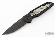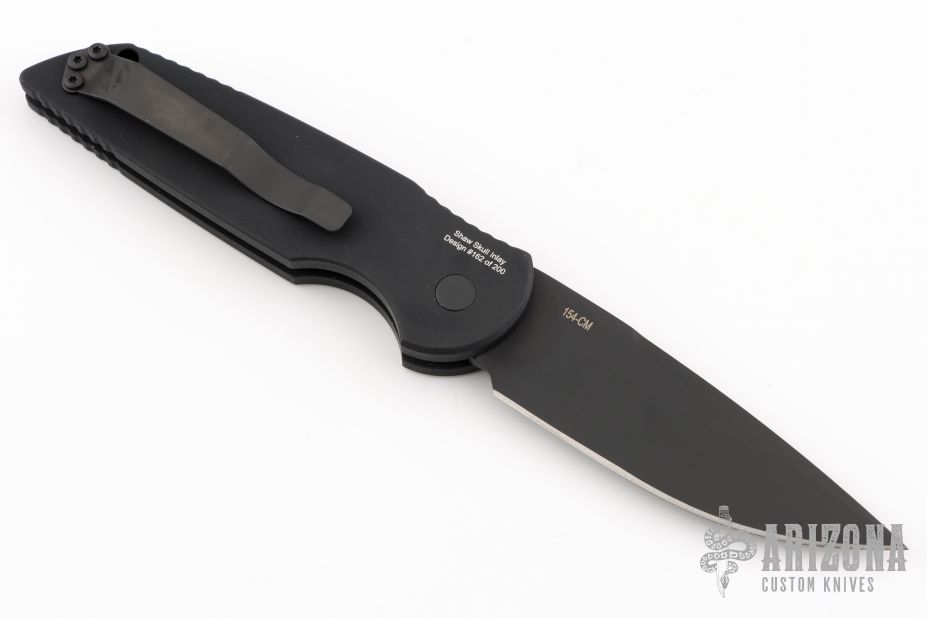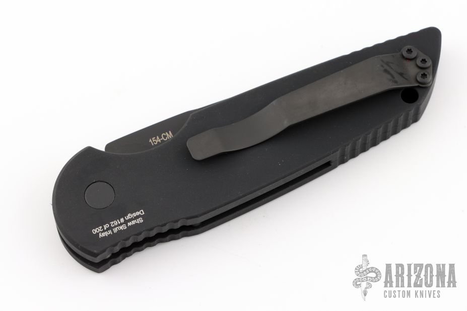 This TR-3 has a black finish blade with a plain edge, and a black aluminum handle with Shaw designed "coin struck" skull and bones inlay on front. Black stainless steel clip. This was a run of 200, this one is #162.
