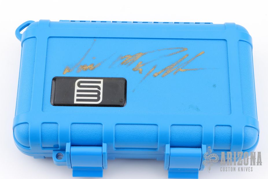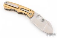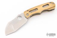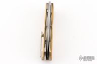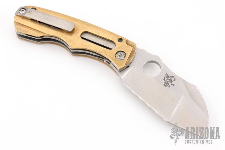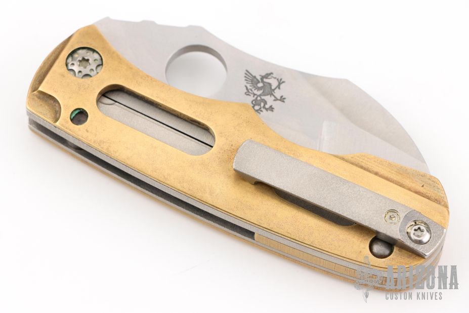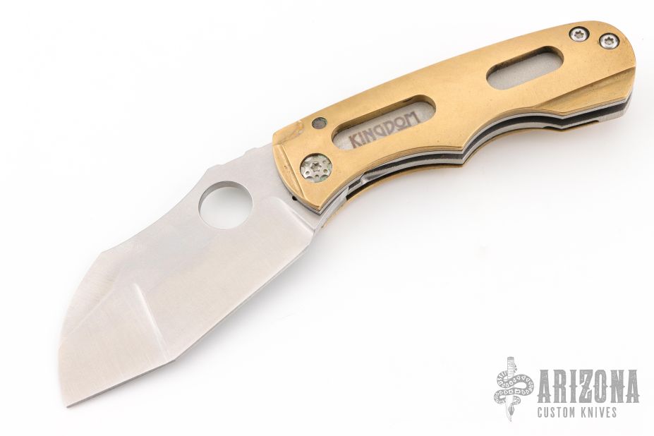 Always meaning to go back to a skeletonized brass overlay linerlock after having built one years ago, Dave finally got it done with this folder. Essentially a super sized griffon, the blade shape on this one has been modified into a stepped profile and further complicated with a duplex compound grind for interest. Built as a super burly titanium linerlock, the brass scales have been gauged so neither side is thicker than the other. Most visually noticeable with these scales, of course, is the "windows" that have been milled through and offer a view of the orange peel textured titanium below. That function was two fold... both to reduce the weight of the folder by removing heavy material, but to also provide a perfect spot to anodize the "Kingdom" logo on the presentation side.
