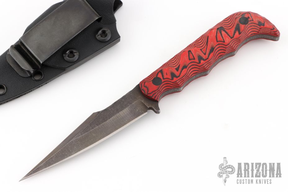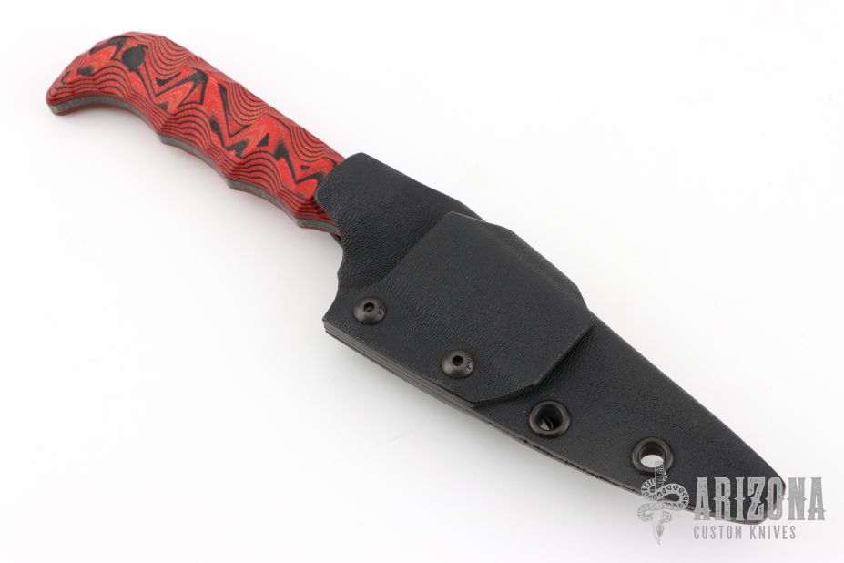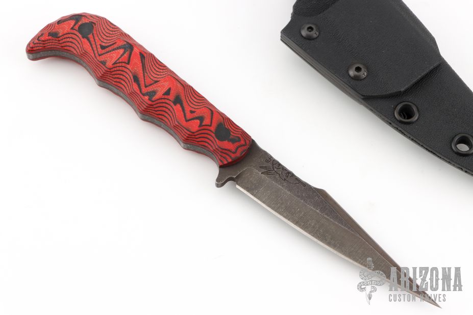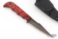 This Senator by Half Face Blades features a dark stonewashed blade with textured thumbrest and a sharpened top edge, .152" blade stock and .798" blade depth, full tang construction. The handle has black/red G-10 scales. Comes with kydex sheath with belt clip, and original box and papers. Excellent condition.