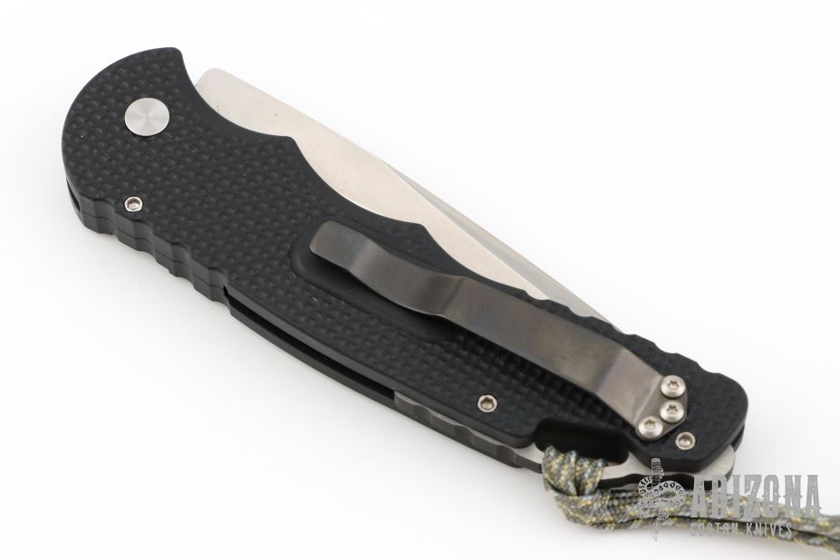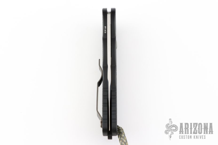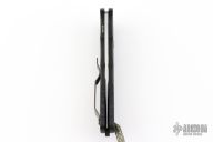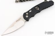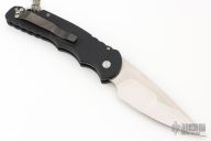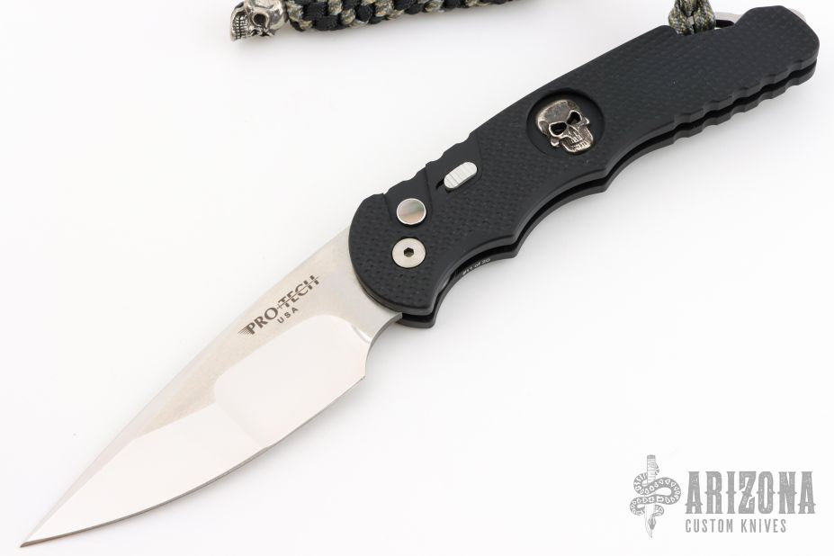 This TR-4 Skull Limited Edition #11 of 20 button lock auto has a mirror finished compound grind 154-CM stainless steel drop/spear point blade with swedge. Handle is textured black anodized aluminum with Bruce Shaw designed sterling silver skull inset, pearl inlaid safety button, matte black finished stainless steel tip up clip, and extended stainless steel backspacer with lanyard loop and lanyard with custom two-tone skull lanyard. Comes with original box, papers, and PT nylon belt sheath. Excellent condition.