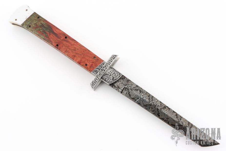 Engraved 11" Tanto Tab Lock Auto - Damascus and Karelian Birch