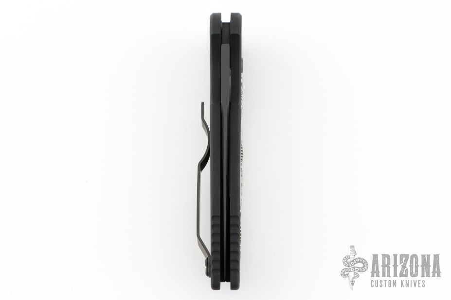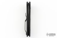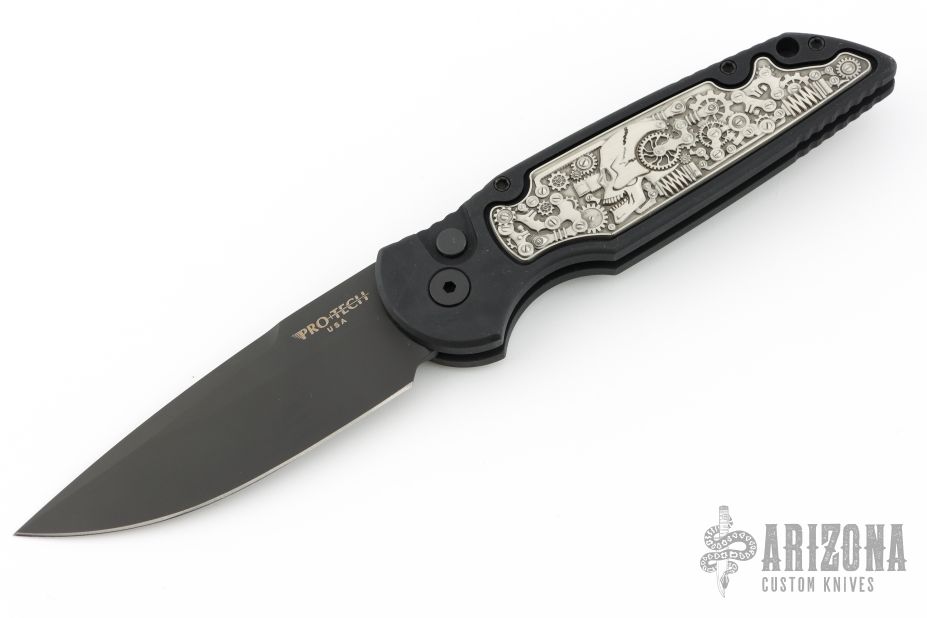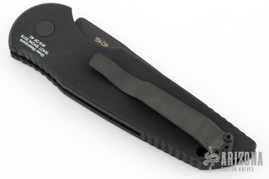 This TR-3.5 model has a black finished handle with a Shaw Steampunk inlay and a black finished blade. The TR-3 Auto is an offering from Protech Knives. It features a 6061-T6 aluminum handle with a black finish and a nickel silver inlay. The 154-CM steel blade is satin finished with a plain edge. Black coated pocket clip and hardware finish off the design. #19 of 40.