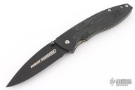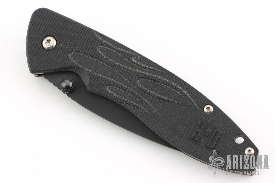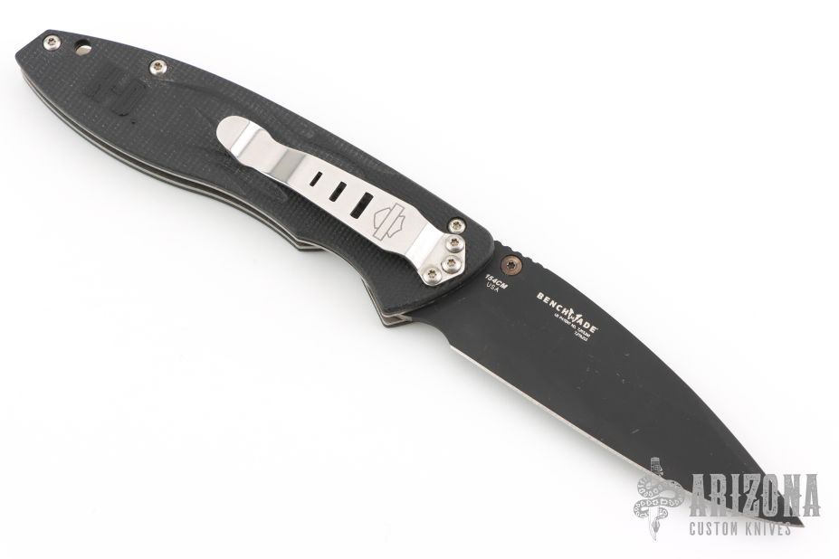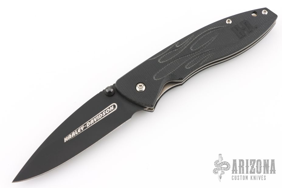 This Harley Davidson Nitrous Assist linerlock folder by Benchmade features a black blade with single thumbstud and a notched thumbrest. The handle has black G-10 scales, titanium liners, tip down stainless steel clip. Nice action and lockup. Excellent condition. Comes with original box and papers.