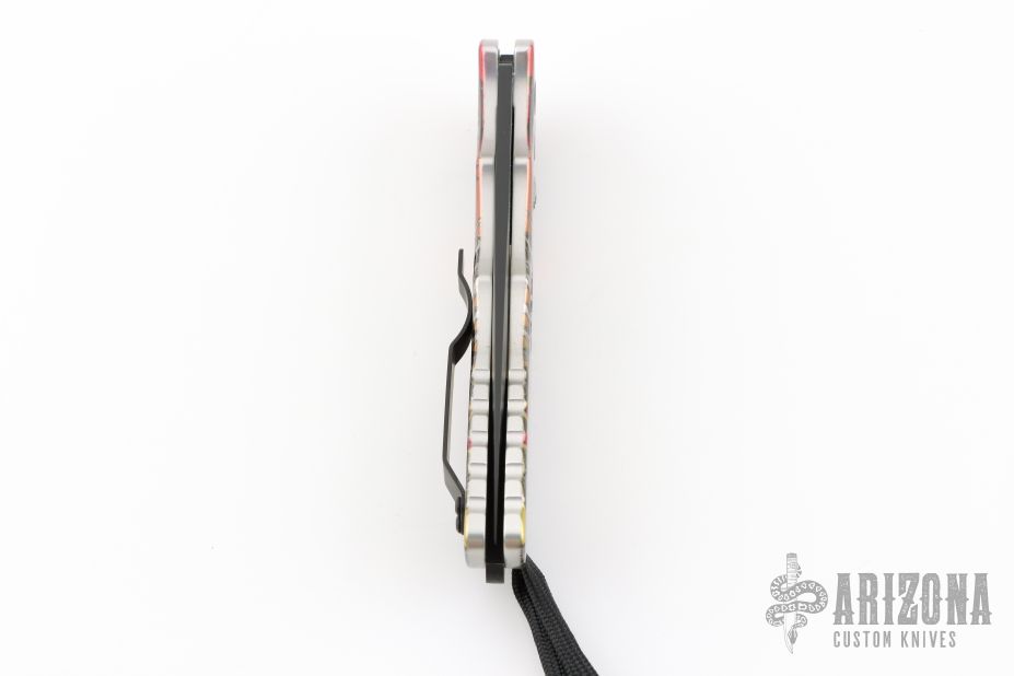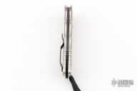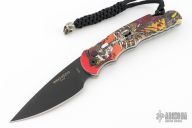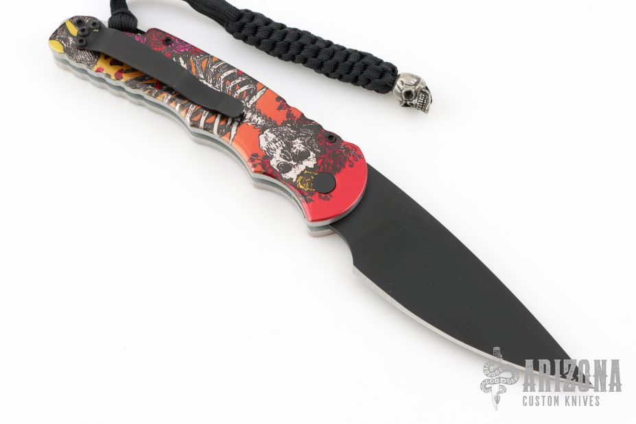 This TR-4.79 has a black spearpoint blade. The handle is PK anodized aluminum with a sterling silver skull designed by Bruce Shaw inlaid. Black finished stainless steel clip for tip up carry. Steel glass breaker and lanyard with skull bead. Secondary safety switch. Comes with original box, papers, and PT nylon belt sheath. Excellent condition.