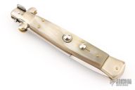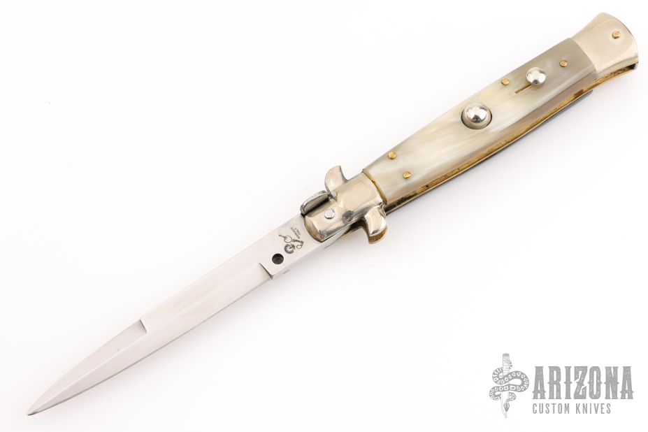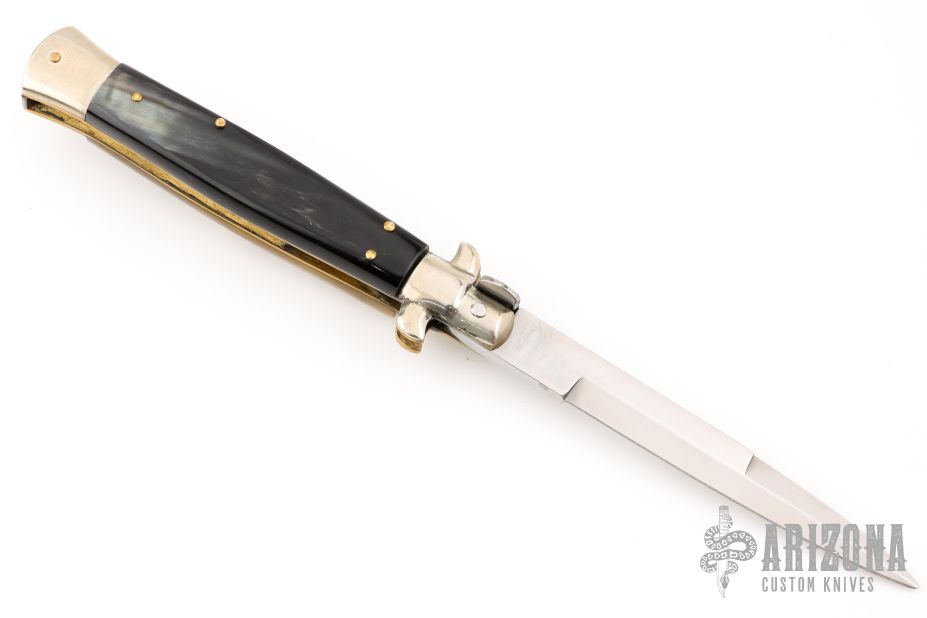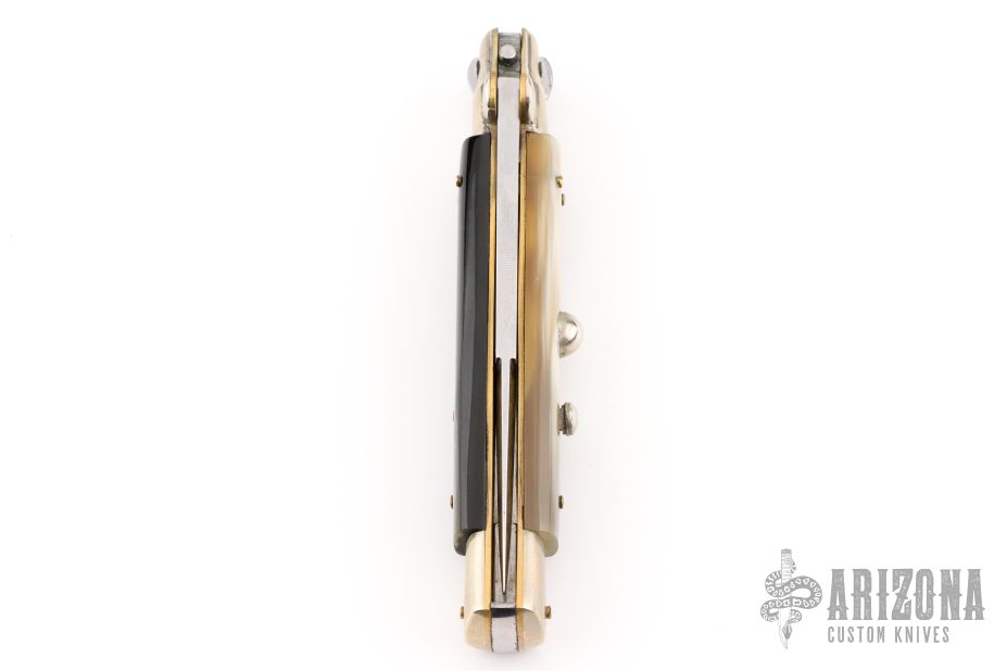 This Fosolone Auto by Renzo Passcotto features a mirror finished blade with false top edge. The handle has buffalo horn scales, brass liners and nickel silver bolsters. Has safety. Has a few light scratches, otherwise excellent condition. Comes with a zippered case.