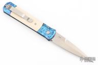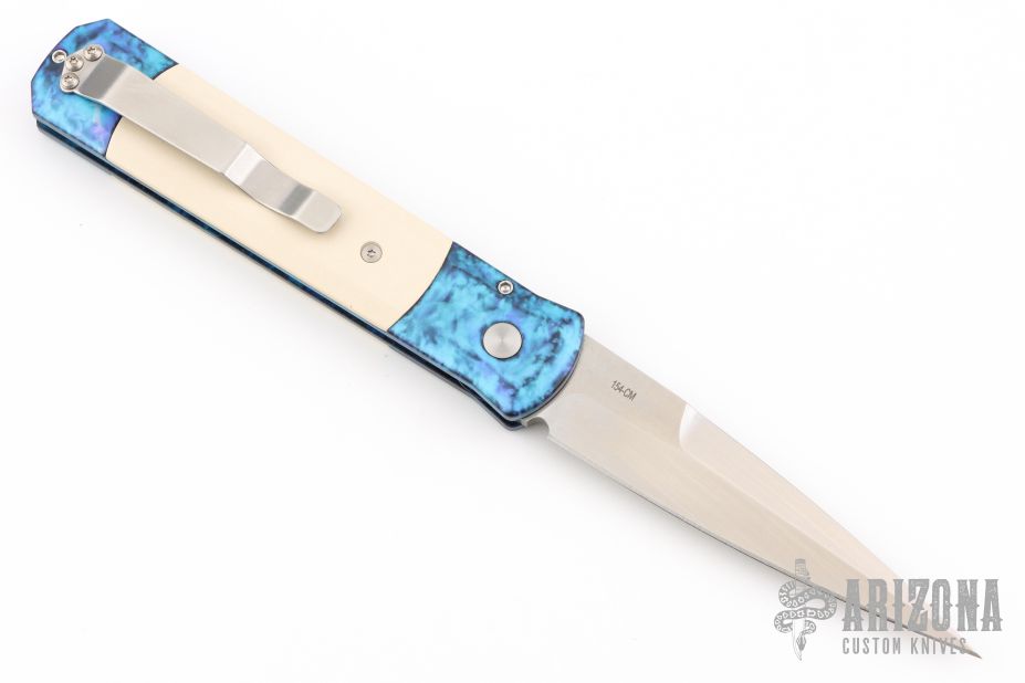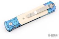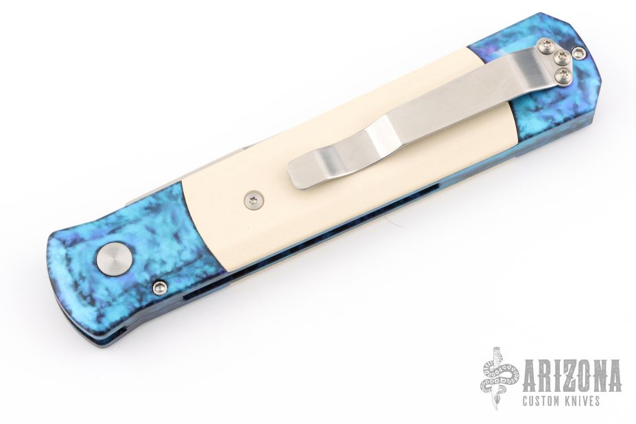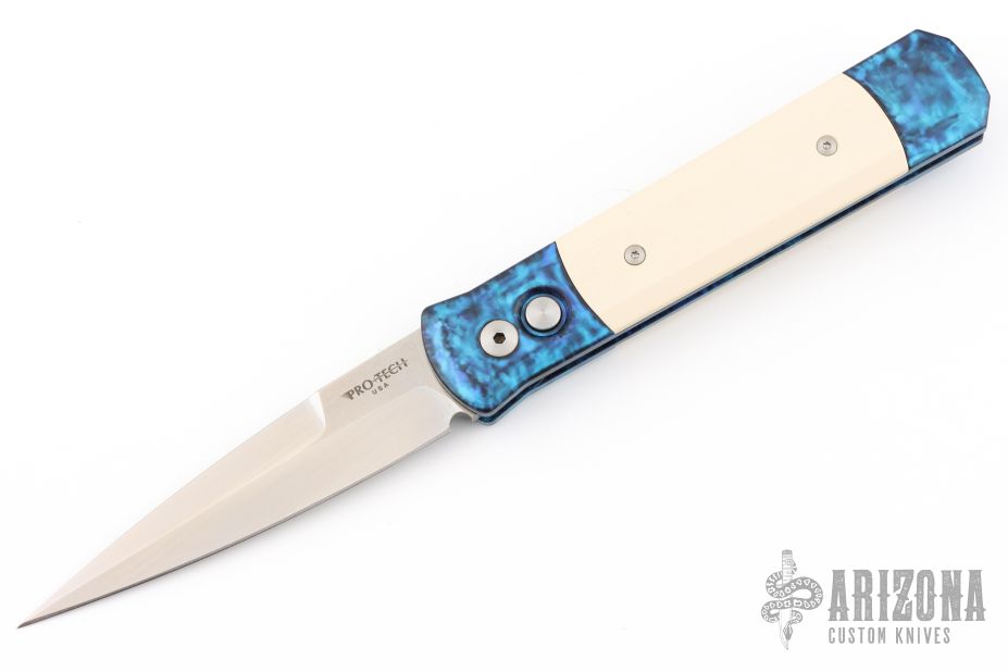 The Godfather 4" blade auto knife represents the influence of original Italian "Stilletto" style auto knife and Pro-Tech's modern coil spring precision.  This Godfather has a satin finish blade and anodized "Jazz" handle with ivory micarta inlays. Satin stainless steel clip. Includes original box and paperwork. Excellent condition.
