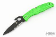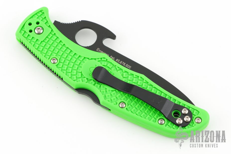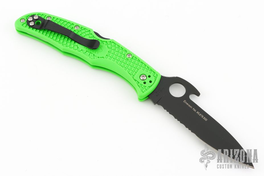 This limited edition Spyderco Endura was made for the Usual Suspect Network in a run of 600 pieces. USN logo on the black blade, thumbhole, wave feature and notched thumbrest, partially serrated edge. Has green FRN handle with black stainless steel clip, 4-way reversible. Excellent condition. Comes with original box and papers.