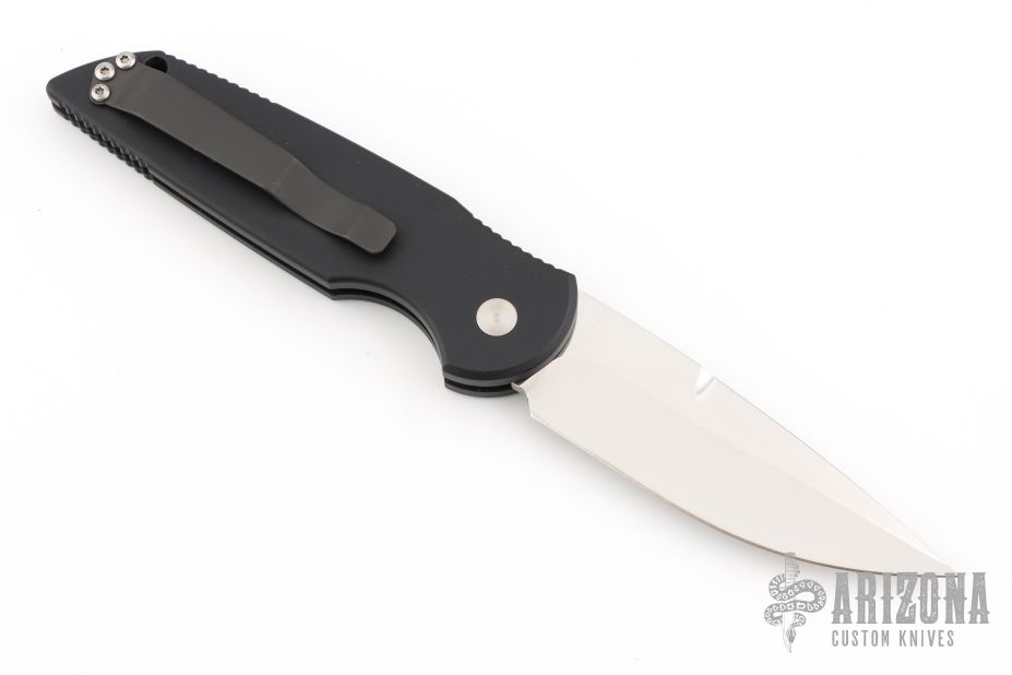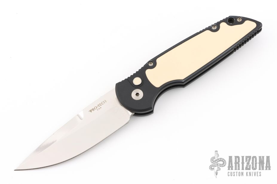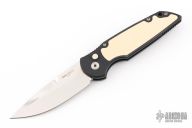 This TR-3 by Protech knives features a mirror polish blade with plain edge. The handle is black aluminum with ivory micarta inlay and push button inlay. Matching tip up clip. Comes with original box and papers. Has a couple light scuffs on the body, otherwise Excellent condition.
