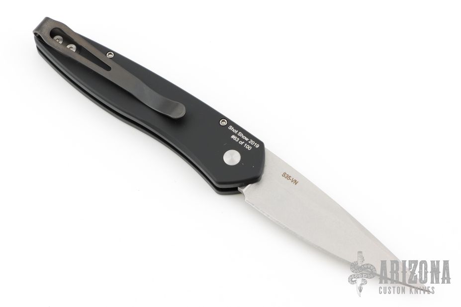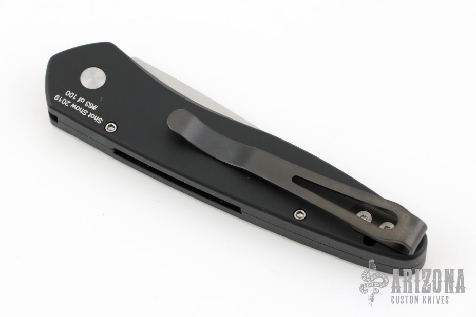 This Newport by Protech Knives features a stonewashed spearpoint blade and black aluminum handle with carbon fiber inlay, and black tip up stainless steel clip. Comes with original box, pouch and papers. Excellent Condition.