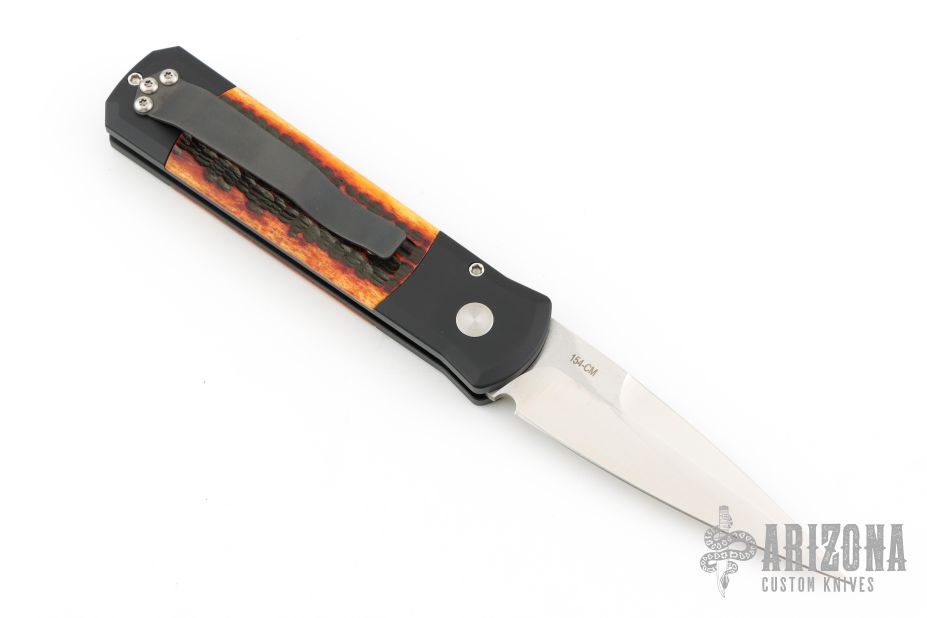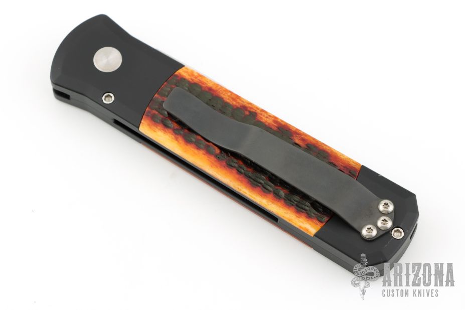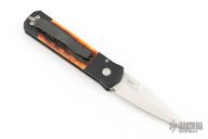 "Like Father, Like Son. This is the highly anticipated 3.25" blade version of our popular Godfather automatic knife. Italian Inspiration and American Innovation have created another superior coil spring action auto knife." This Godson side opening coil-spring automatic features a satin finished blade and anodized black frame jigged bone inlays. Mosaic push button. Black stainless steel clip. Comes with original box and papers. Excellent condition.